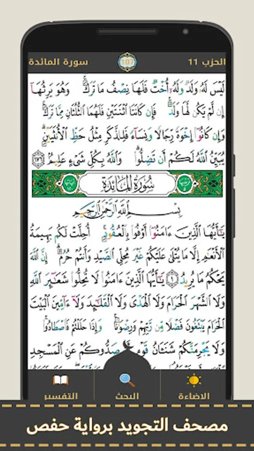 This application is identical to the paper version of the colored Tajweed Quran with interpretation in the narration of Hafs