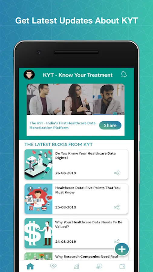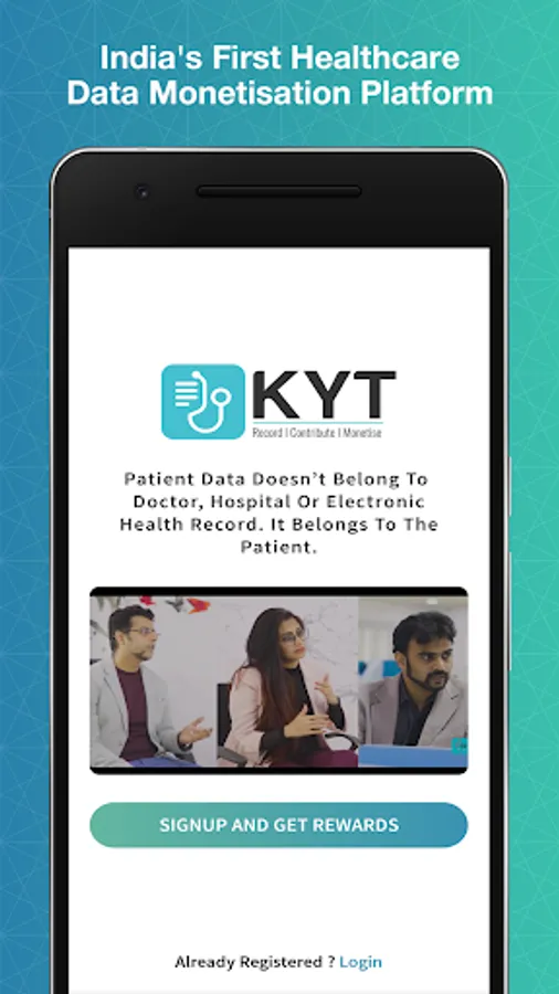 KYT or "Know Your Treatment" mobile application is based on the principle that patient data doesn't belong to a doctor, hospital or electronic health record; it belongs to the patient. He has the right to share or not to share the same with any other healthcare stakeholder. It is a simple to use cloud based application for all your medical record keeping, which allows you to access them on the go, while giving you incentive for optimal record keeping and healthcare data sharing.