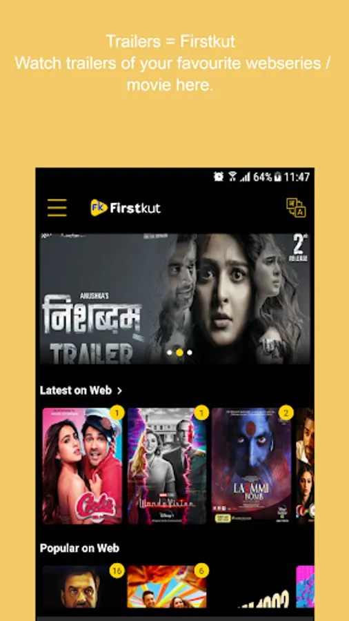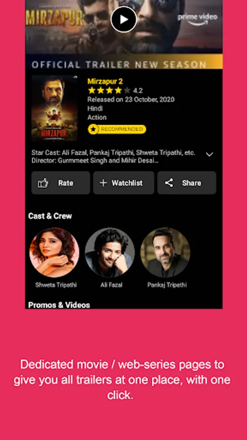 When you wish to find out what to watch next, Firstkut will be at your service with details of the latest & popular shows and movies available to you. You will get all trailers of the show/movie on a single page and will be able to see ratings by other users. We have also added a 'recommendation' tab for good measures indicating the content that our team likes best.