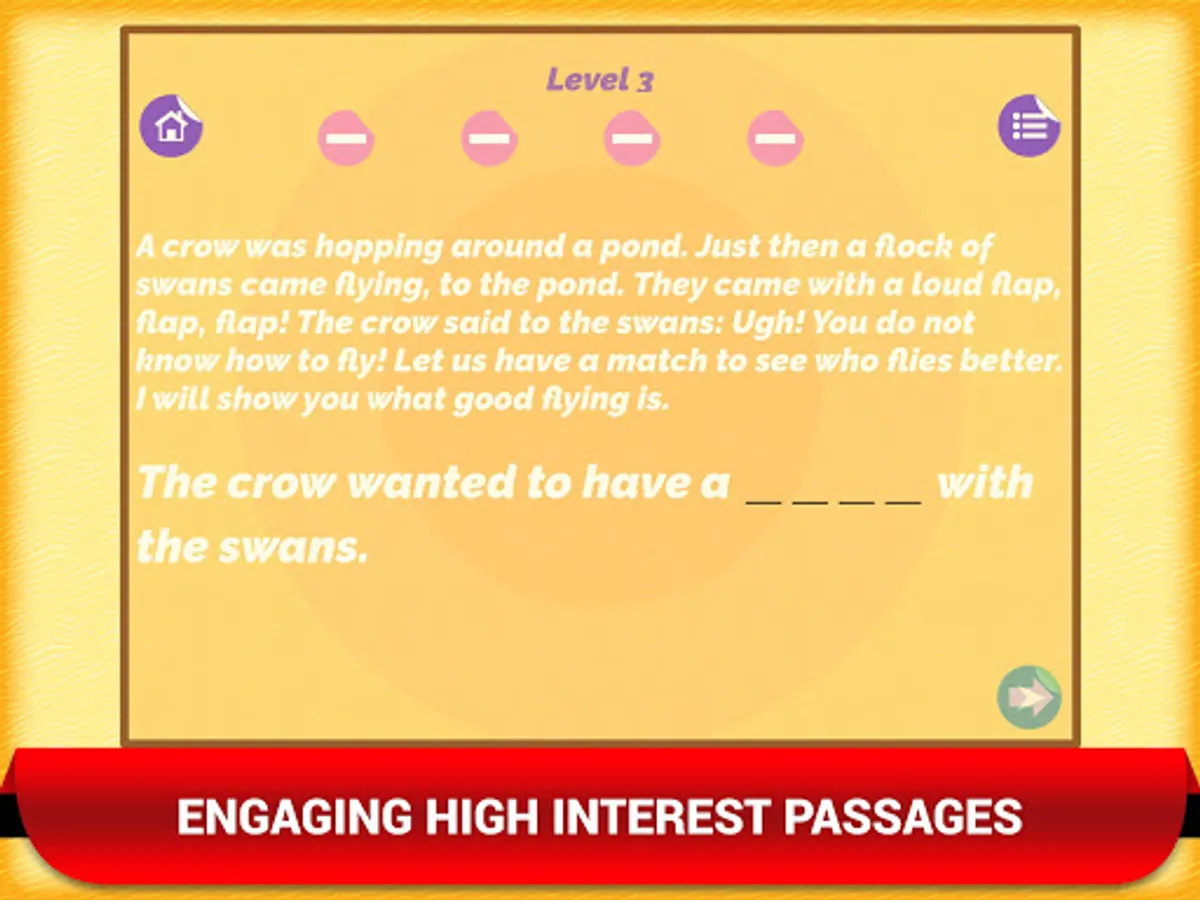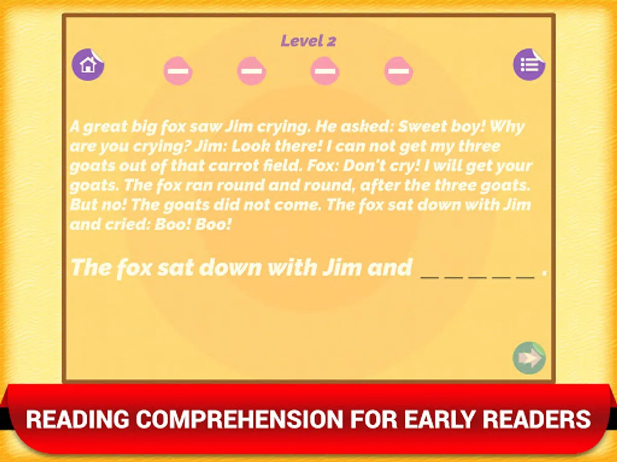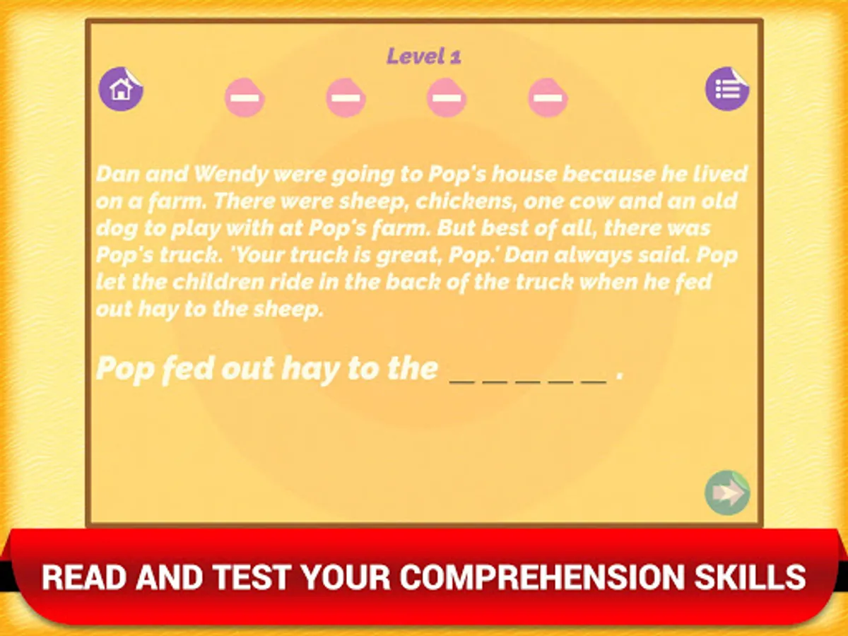 This comprehension reading test app is aimed at helping individuals who need extra practice with reading comprehension and learning how to recall specific details of stories. Engaging, colorful, and smooth child-friendly game play and controls which makes playing this english comprehension reading game more exciting and learning a fun thing for kids. You don’t need to look for activities and passages scrolling down the internet as you can all of it in one reading comprehension games.