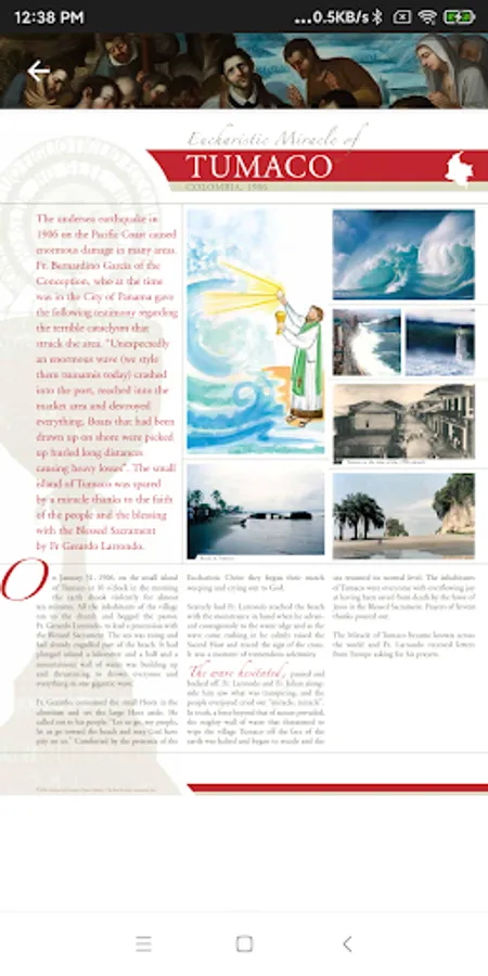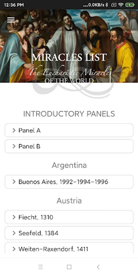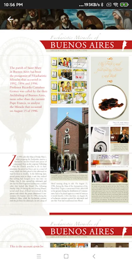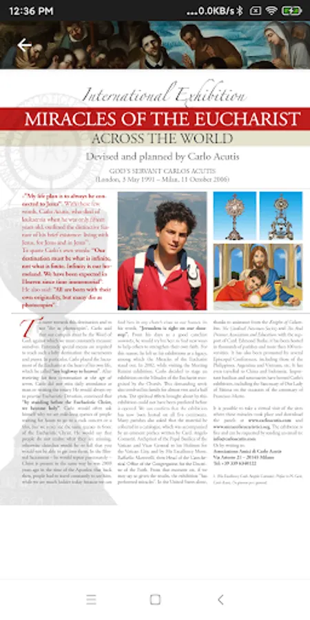 The exhibition presents, with an extensive photographic review and historical descriptions, some of the main Eucharistic Miracles (about 136) which occurred over the centuries in various countries of the world and recognized by the Church. Through the cards (about 166) it is possible to "virtually visit" the places where these Miracles happened.