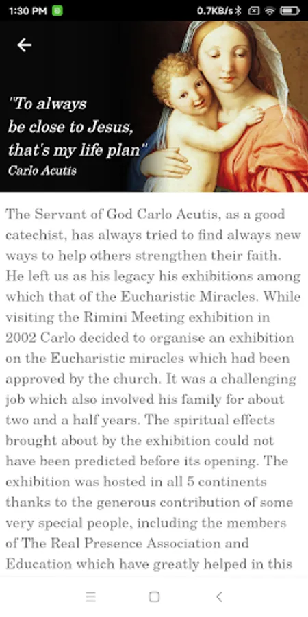The Servant of God Carlo Acutis, as a good catechist, has always tried to find always new ways to help others strengthen their faith. He left us as his legacy his exhibitions among which that of the Eucharistic Miracles. While visiting the Rimini Meeting exhibition in 2002 Carlo decided to organise an exhibition on the Eucharistic miracles which had been approved by the church. It was a challenging job which also involved his family for about two and a half years. The spiritual effects brought about by the exhibition could not have been predicted before its opening. The exhibition was hosted in all 5 continents thanks to the generous contribution of some very special people, including the members of The Real Presence Association and Education which have greatly helped in this work.