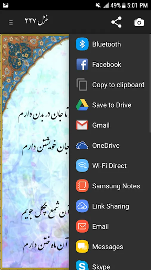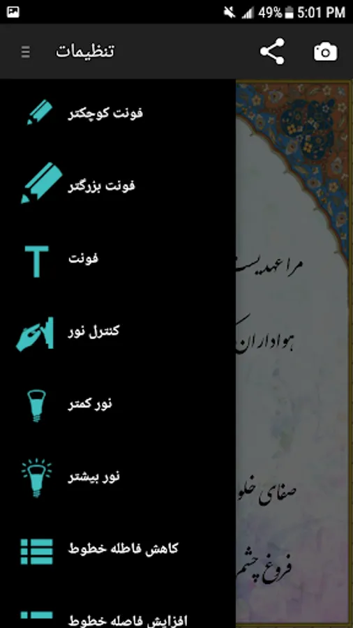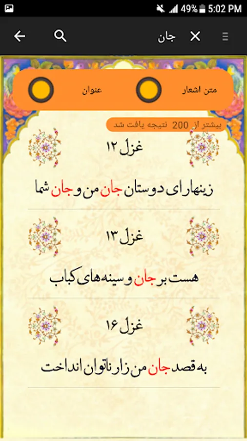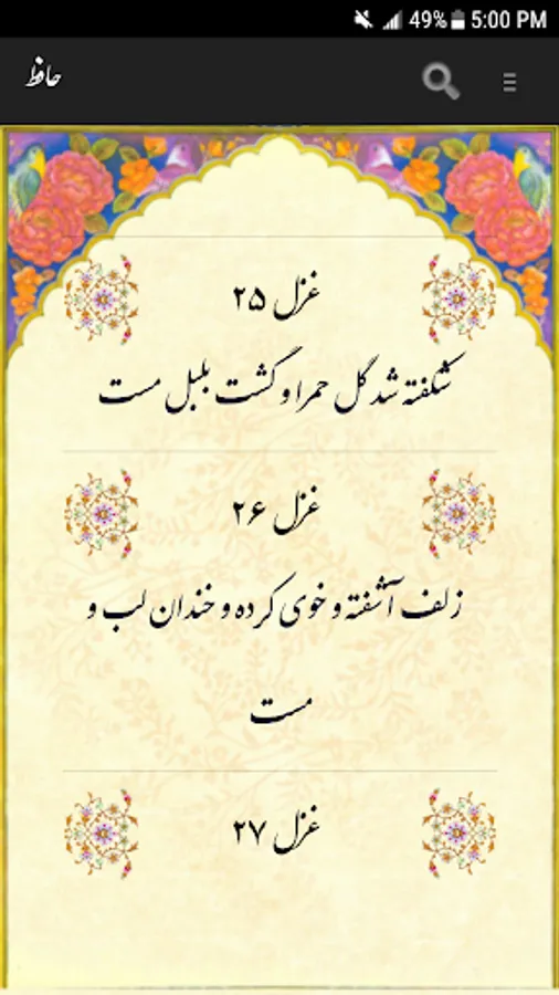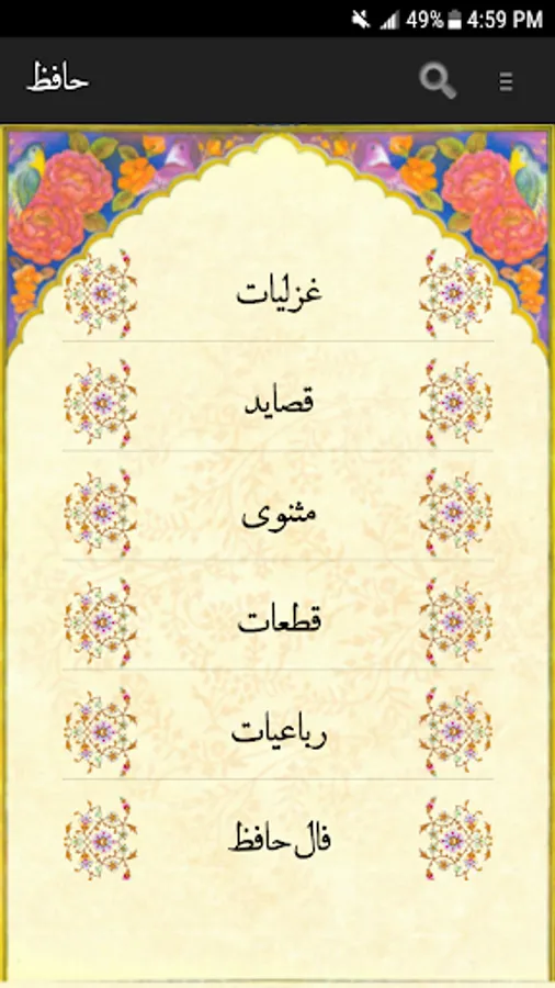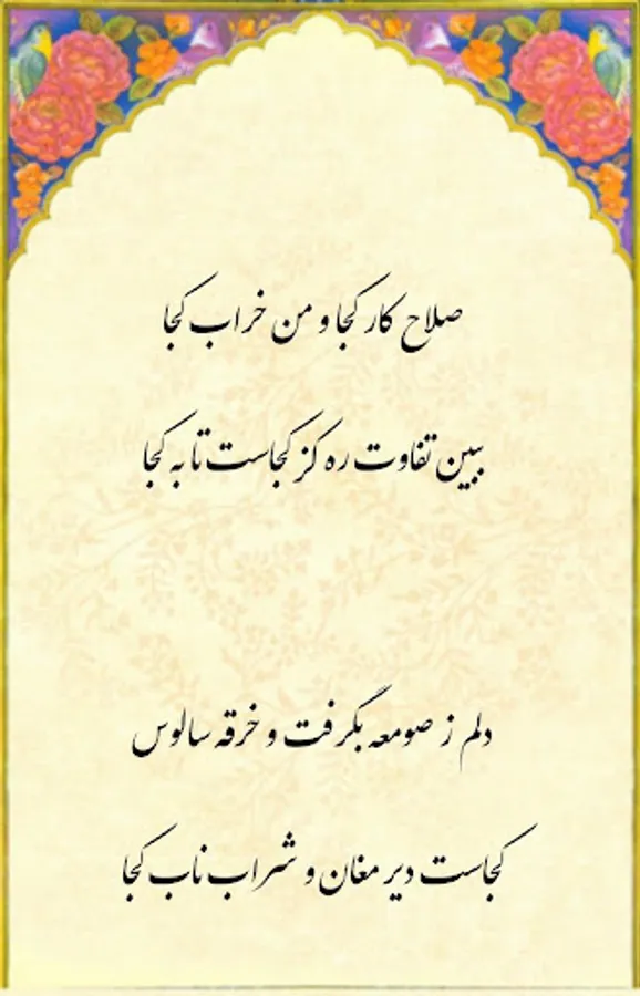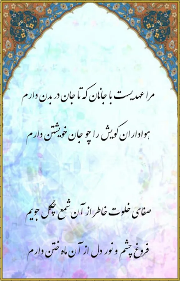 The app has a different background for each collection and the ability to select fonts from beautiful Persian fonts like Nastaliq, Thallis, Naskh and more.