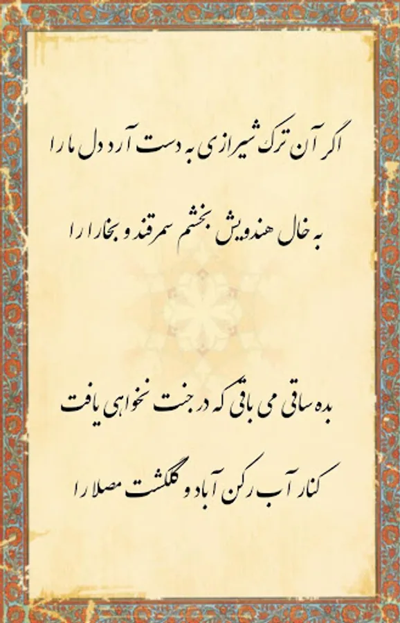 Khajeh Shamsedin Mohammad bin Baha'addin Hafiz Shirazi, known as Lassan al-Ghab, and Tourajman al-Asarar, the great poet of the eighth century, is one of the world's renowned speakers. The great poet has devoted numerous and varied works to various literary themes, but most of his fame is due to his sonnets. . In this program, the collection of works by this great poet is presented to you by loved ones in a very nice program. This app includes: