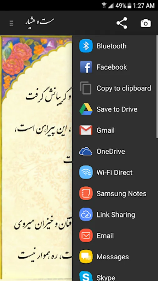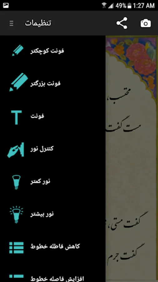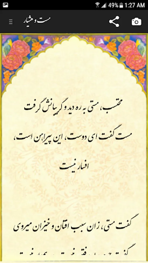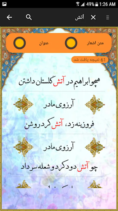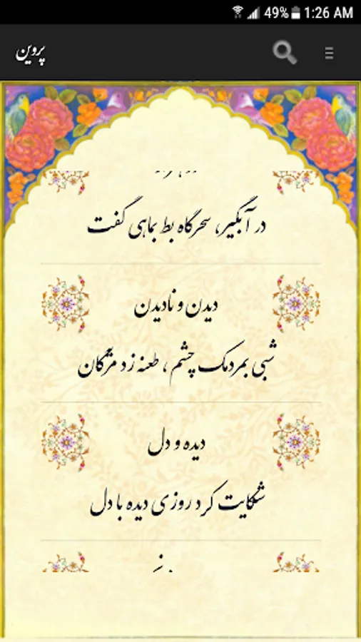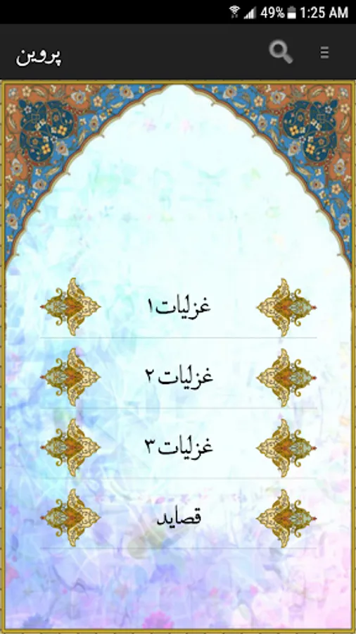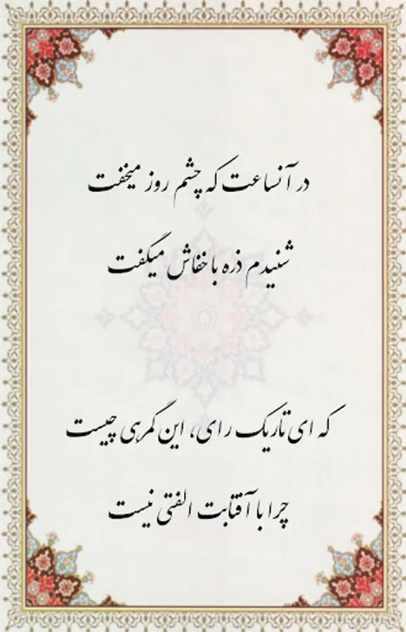 The app has a different background for each collection and the ability to select fonts from beautiful Persian fonts like Nastaliq, Thallith, Naskh and more.