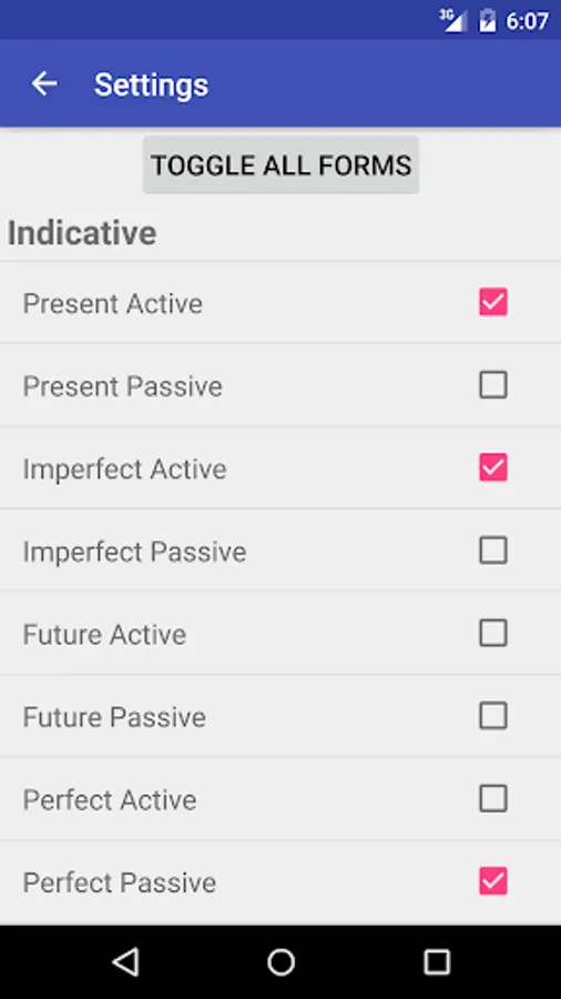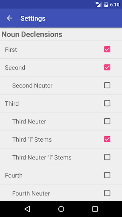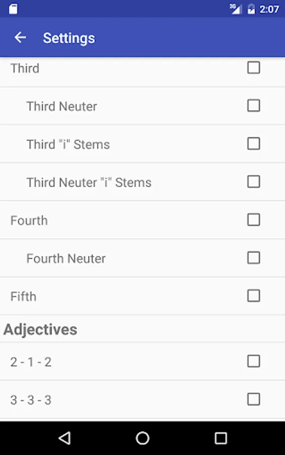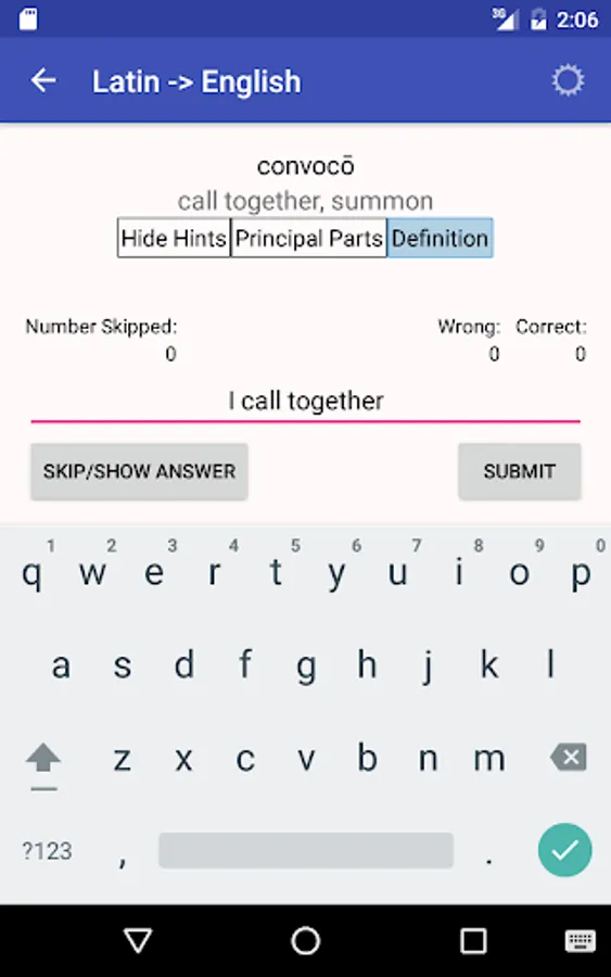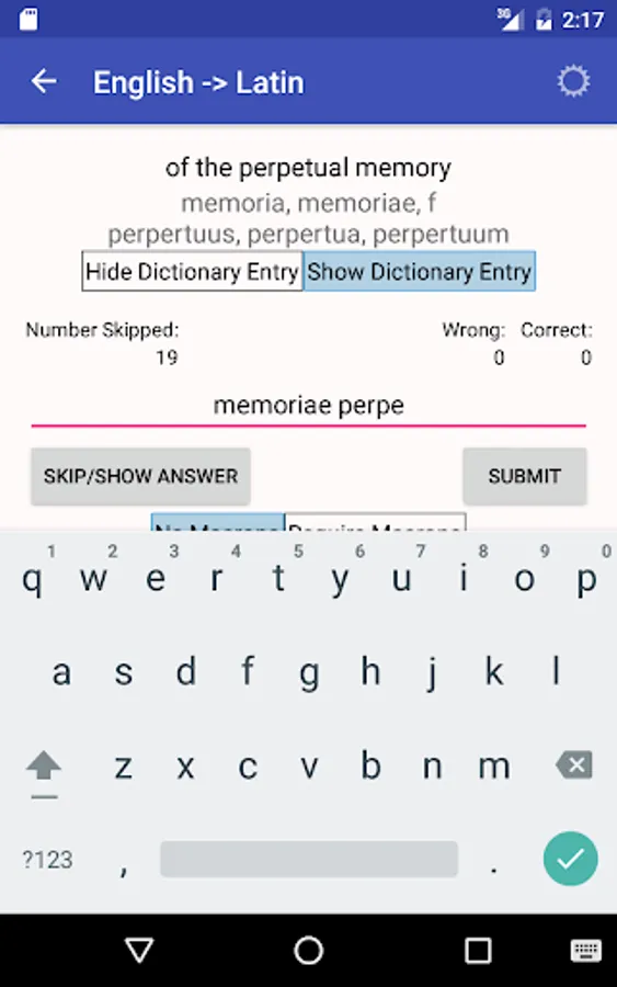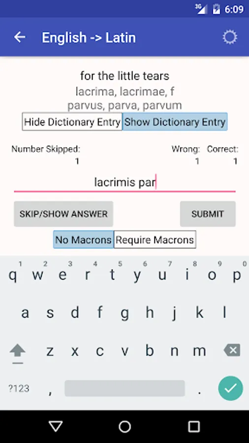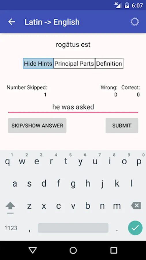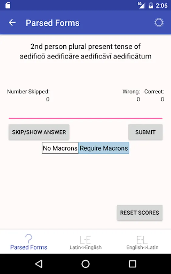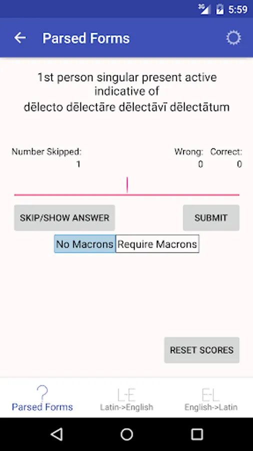- choose from 3 different modes: give the requested form, translate Latin to English, and translate English to Latin