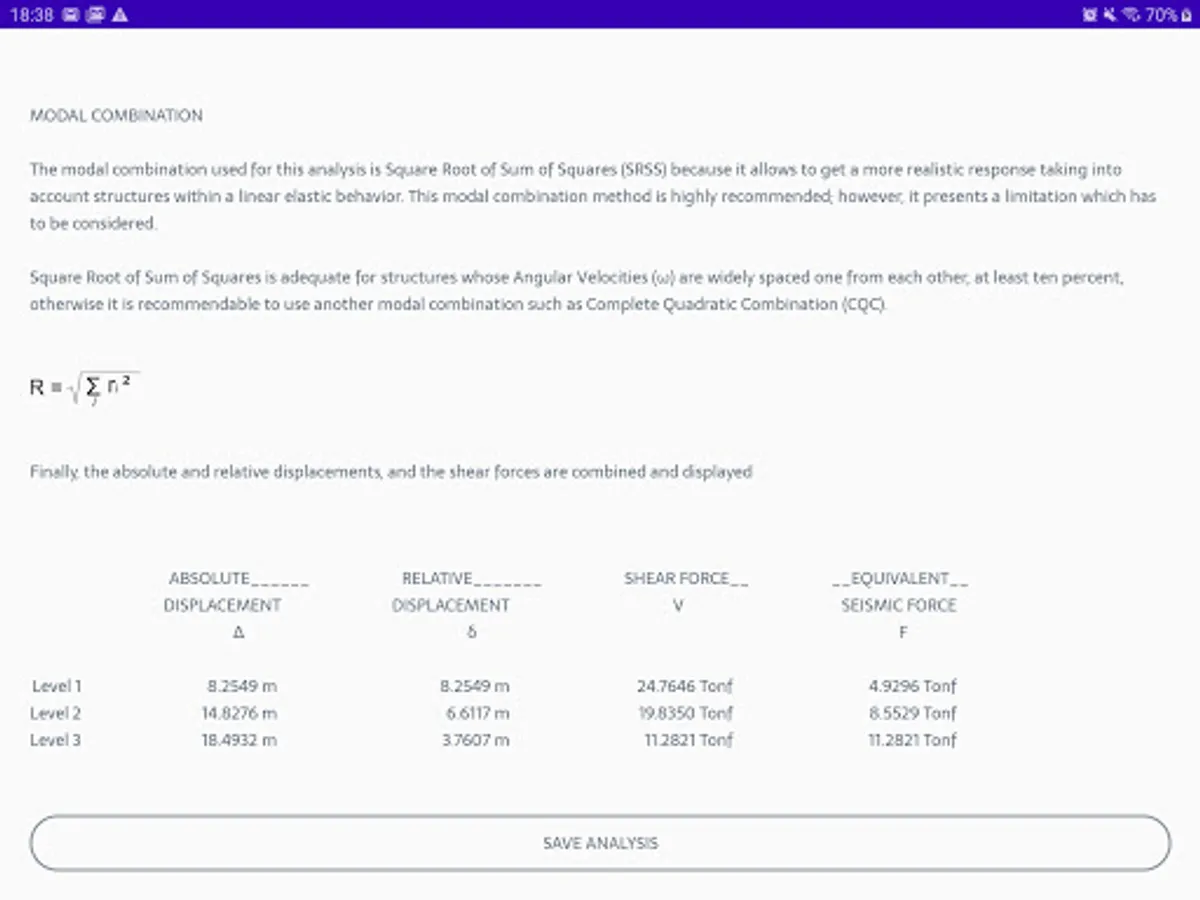 -"Square Root of Sum of Squares" (SRSS) for obtaining Absolute Displacements, Relative Displacements, Shear Forces.