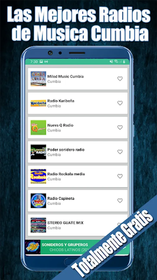 Musica de Cumbias Gratis is an application with which you can listen to Tropical Music, Cumbia Music, Cumbias Mix for free from your cell phone. Now you can listen to Cumbias Sonideras music from your favorite station anywhere. This application requires an internet connection.