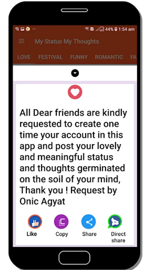 “My Status My Thoughts” is a totally free app. Users can post their status, thoughts, ideas, personal feelings and so more in this app. It is just social platform where users can share their emotions, thoughts and more like this.