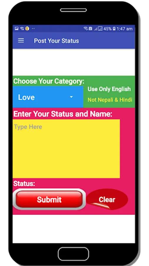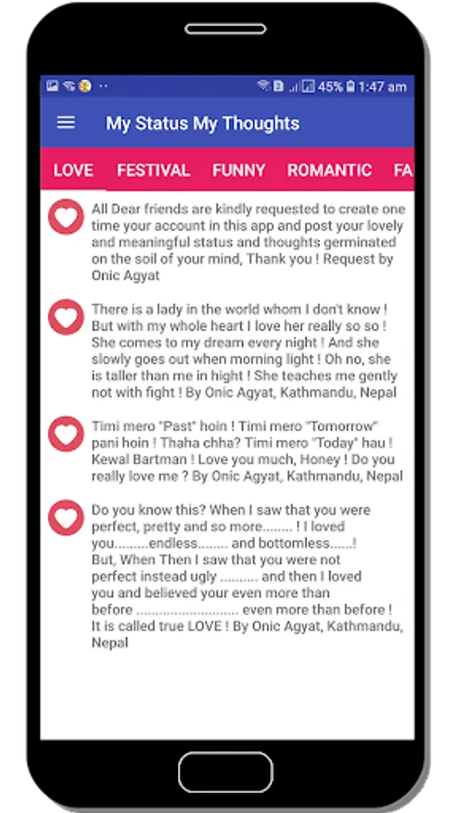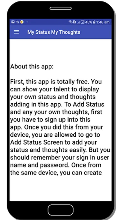 You can show your talent to display your own status and thoughts adding in this app. To Add Status and any your own thoughts, first you have to sign up into this app. Once you did this from your device, you are allowed to go to Add Status Screen to add your status and thoughts easily.