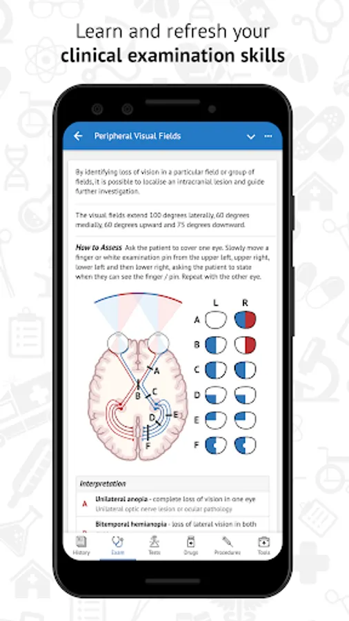 • Encyclopaedia: delve into symptoms, signs, test findings, drugs and diseases.