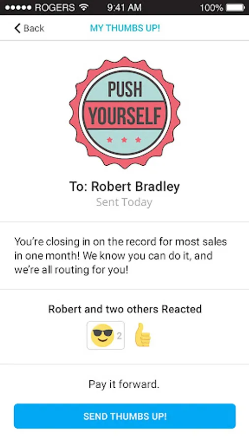 Increase employee satisfaction and engagement by sending "Thumbs Up"! To reward or motivate fellow employees or staff at a touch of a button from your mobile device.
