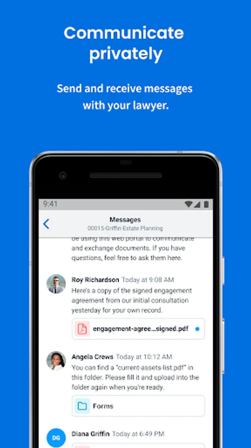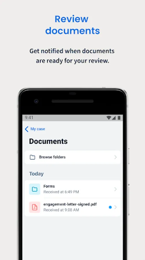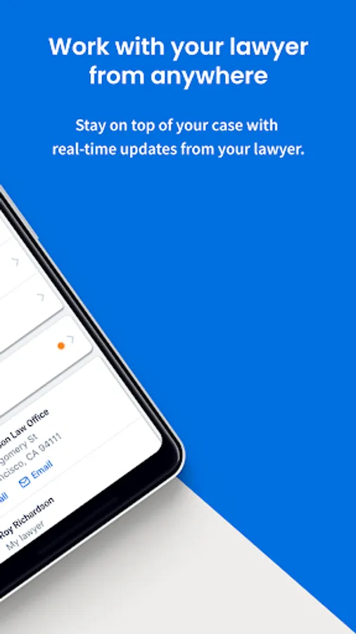 ・Stay on top of your case. Keep files and messages organized in one central place and get notifications when documents are ready for review.