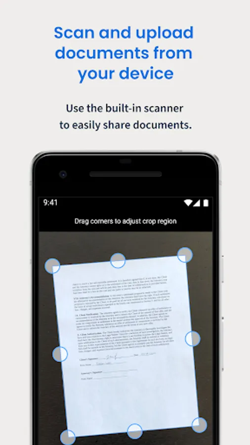 ・Securely send documents. Scan documents using the built-in scanner or upload them directly from your file folder or camera roll.