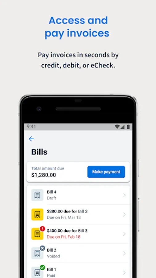・Access and pay invoices. Make payments in seconds with credit, debit, and eCheck options or view your payment history.