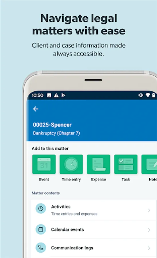 The Clio Mobile App lets you stay profitable and productive by accessing essential case and client information remotely. Update case statuses, communicate with clients and firm members, and review, share, or upload documents all from the palm of your hand.
