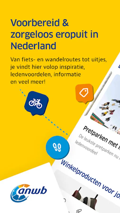 Along the way you will receive tips for nice places to take a break. In addition, the app offers exclusive member benefits for days out, theater productions, city trips, cycling and hiking accessories and more. Including handy possibility to report damage or theft for members with the ANWB Stay Cycling Insurance.