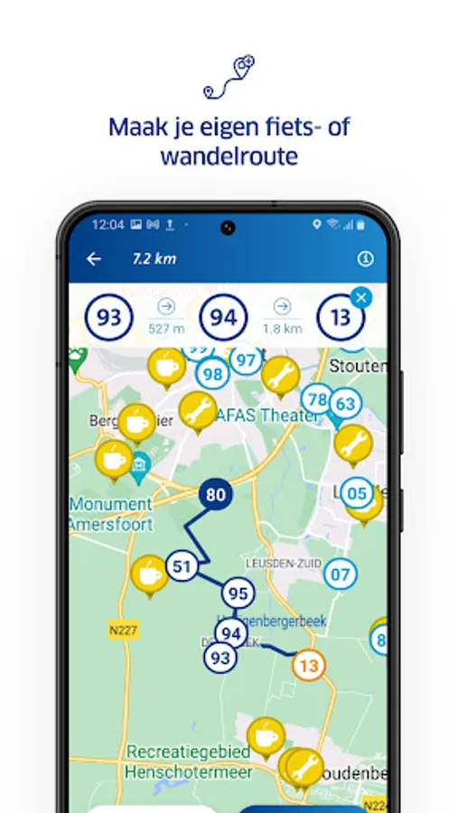 It is also possible to create your own cycling and walking route in the app via nodes. That is very simple. When you open the ANWB Eropuit app, you will see 'Create your own route' on the screen. You will then see all the nodes around the place where you are at that moment. When you're ready, you can save the route (members only) and/or immediately start cycling or walking.