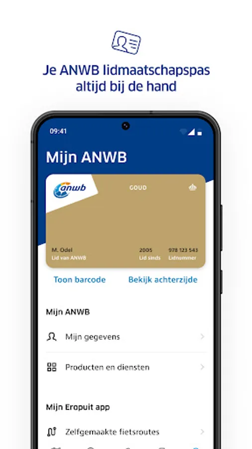 • Log in with your personal My ANWB account and you will always have your digital ANWB membership card at hand. This way you don't have to take a separate card with you and you have quick access to your data.