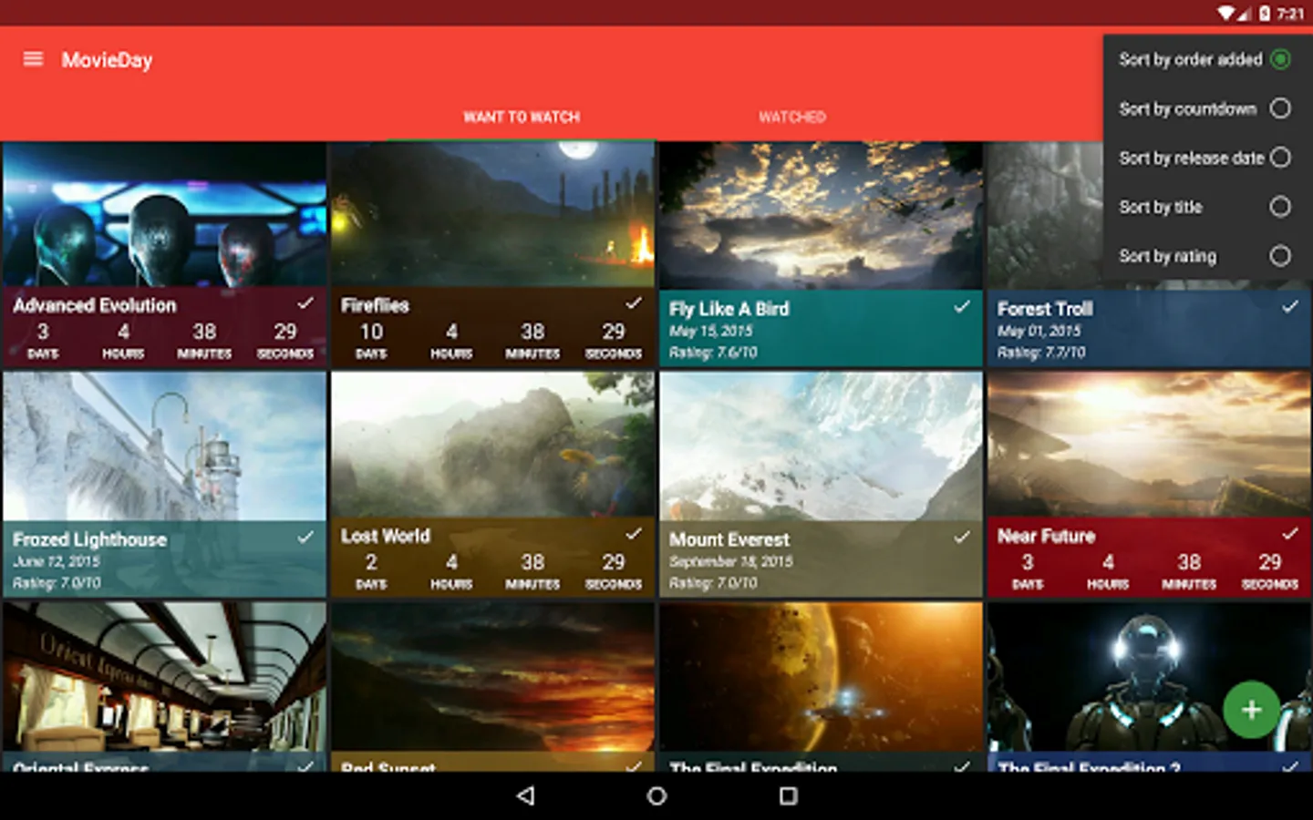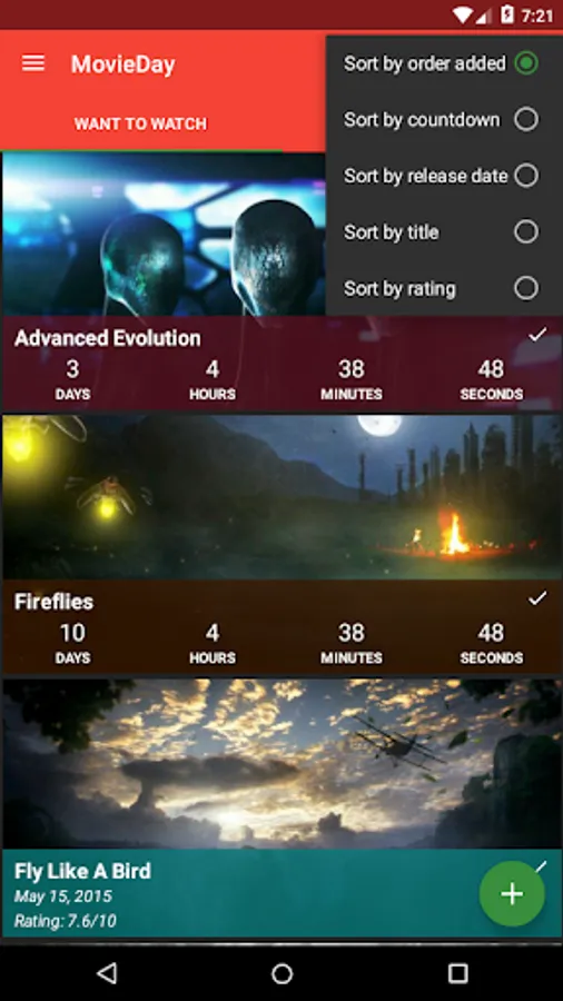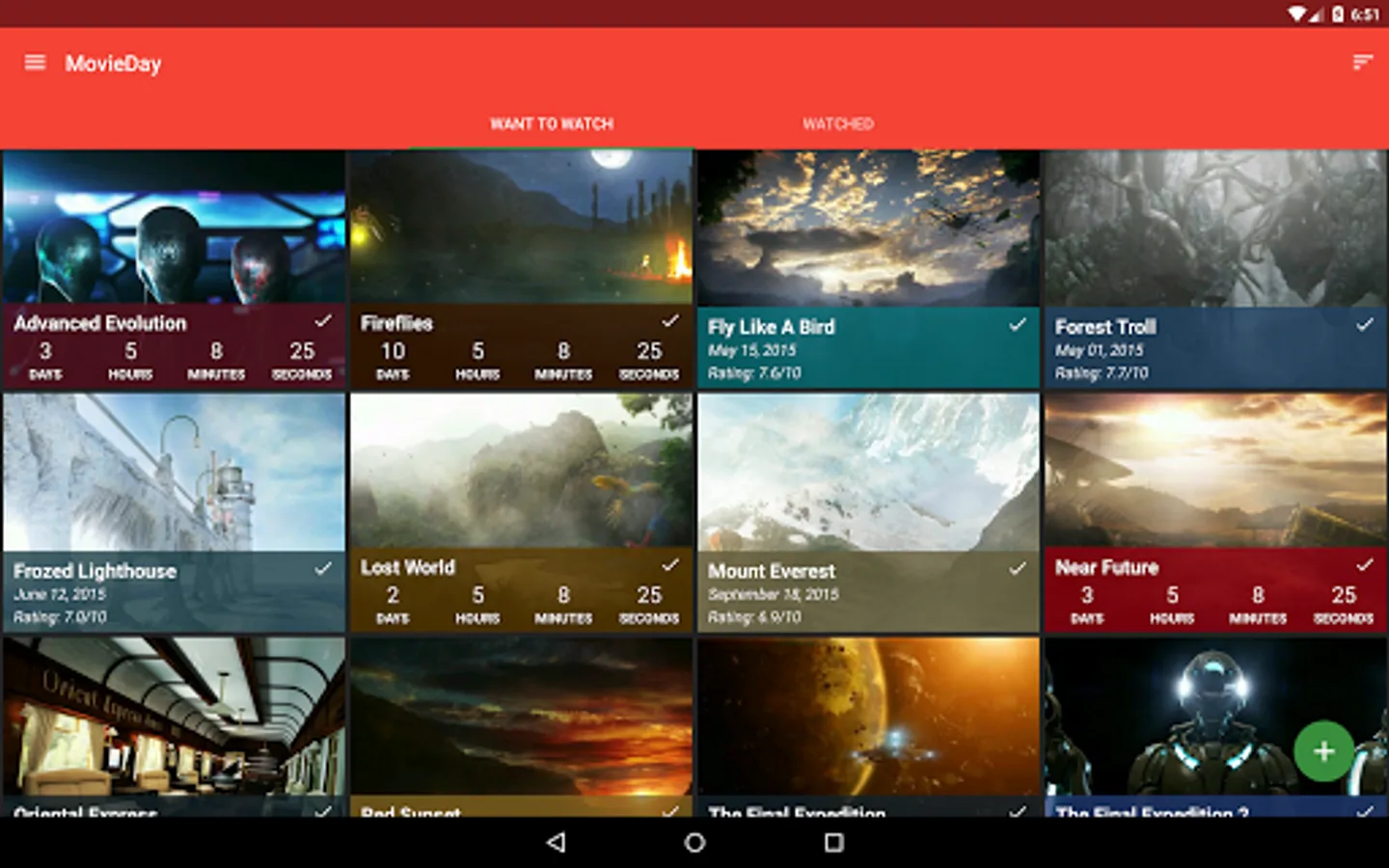 MovieDay lets you easily add an unlimited amount of movies to your "Want To Watch" and "Watched" lists! Plus it will automatically show a countdown timer for a movie that hasn't been released. The countdown timer is also visible on every list for every movie that is coming out.
