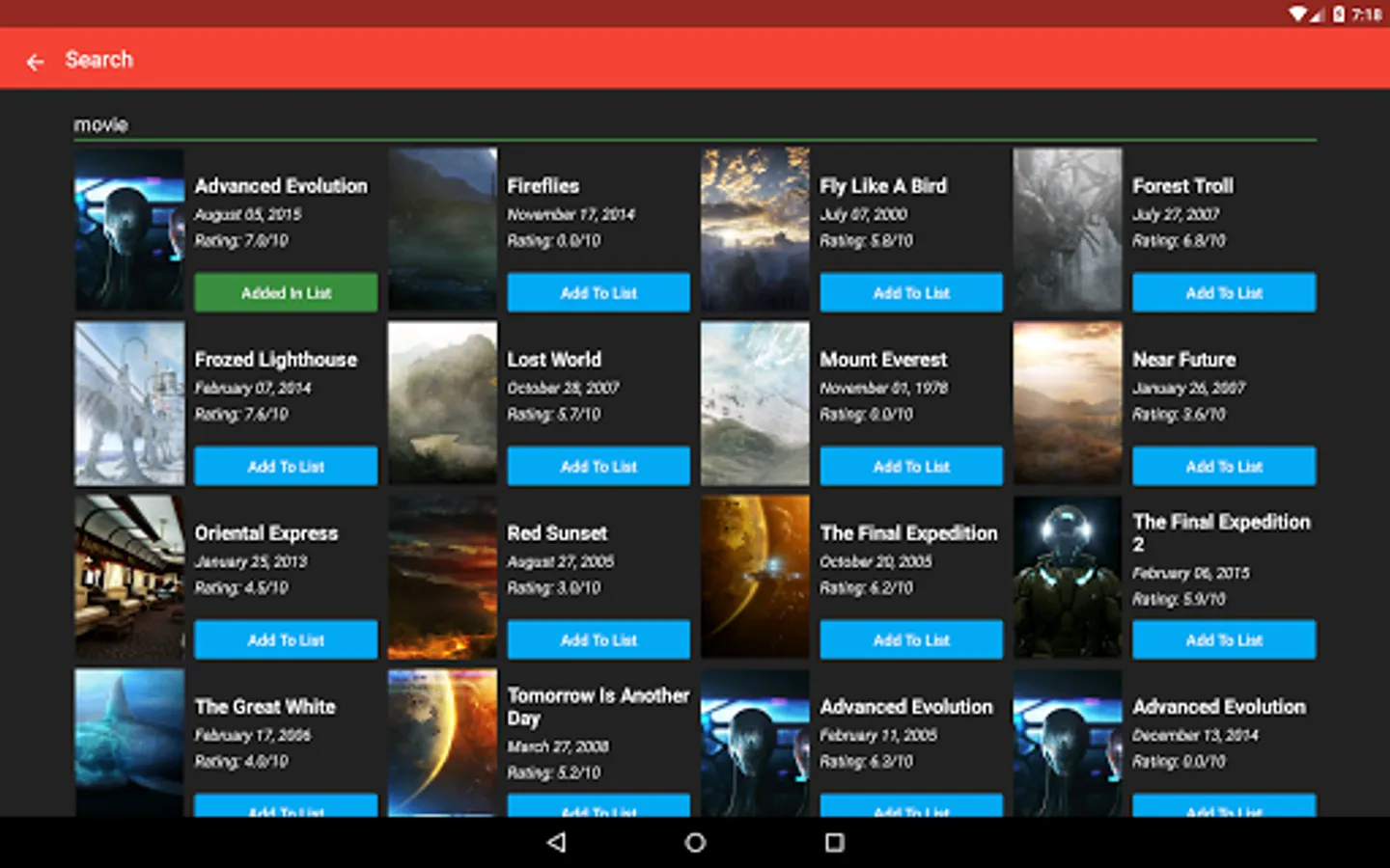 - Movie lists are stored locally (no registering or logging in required)