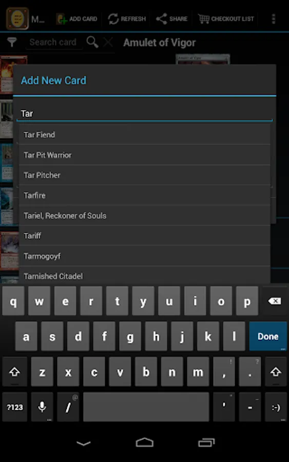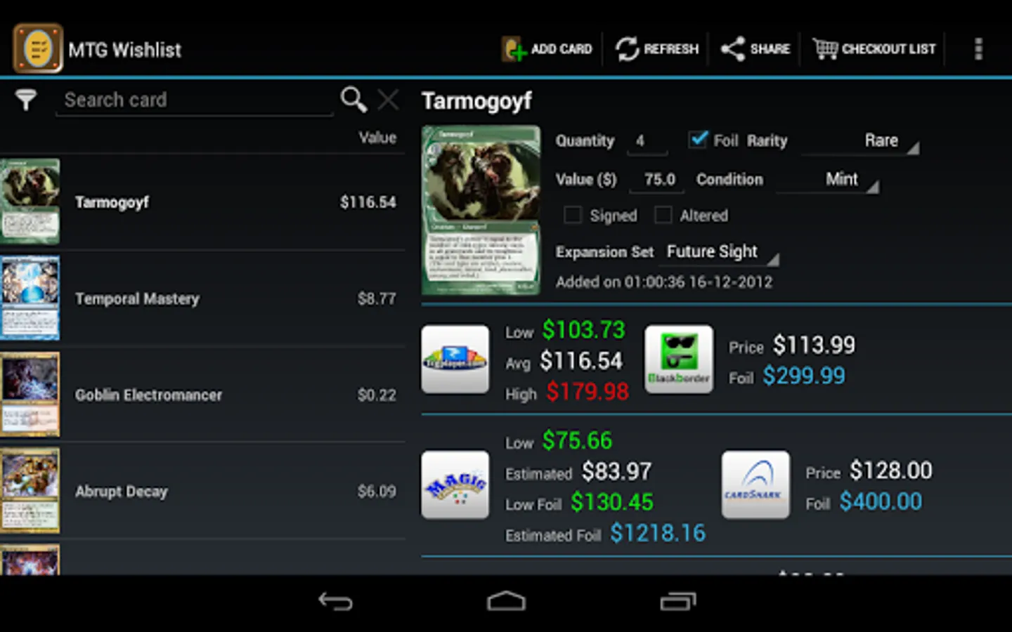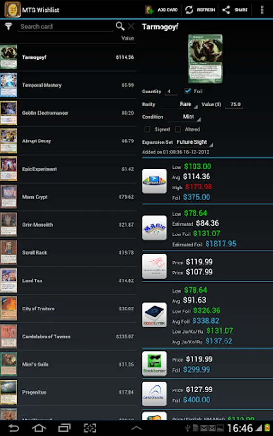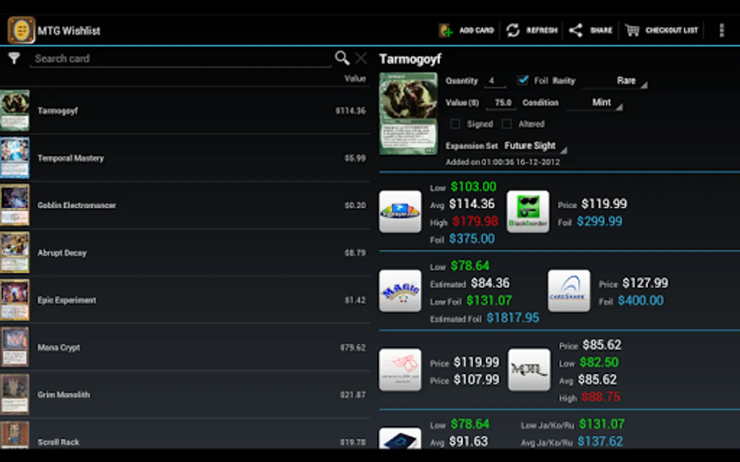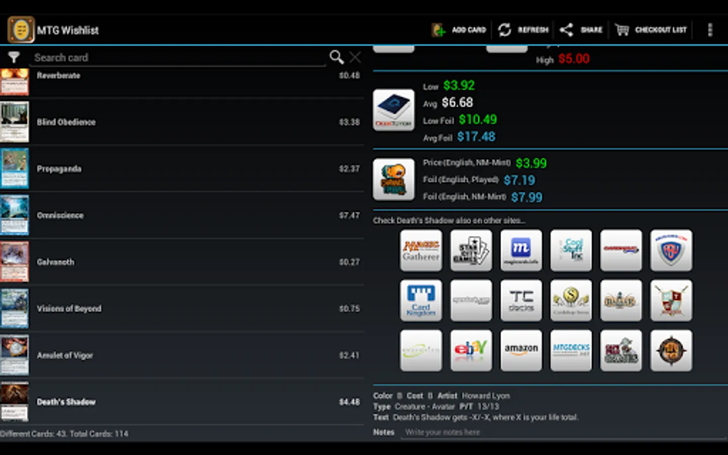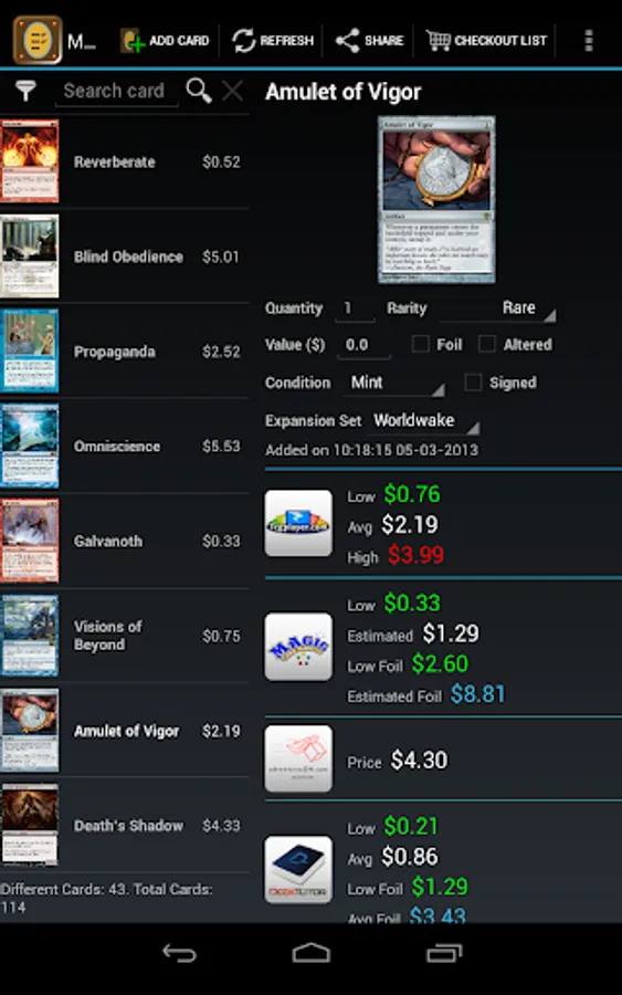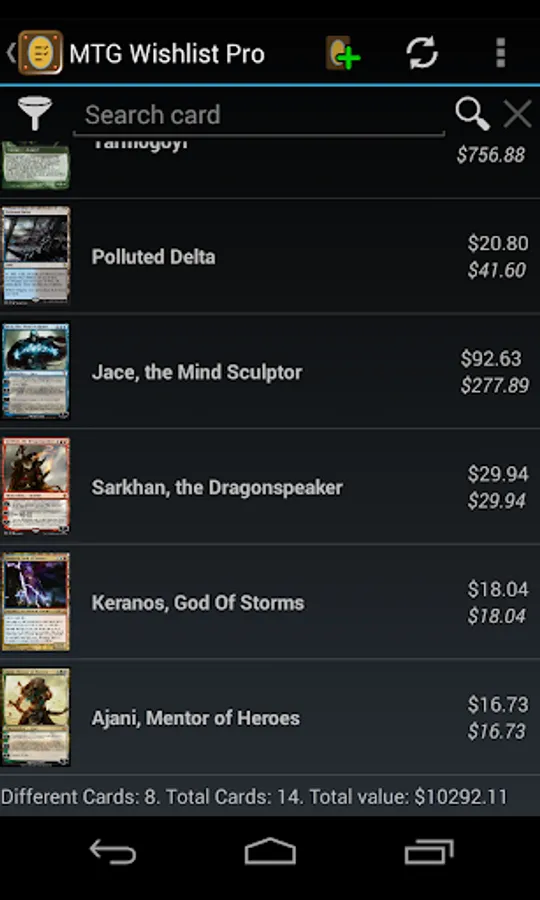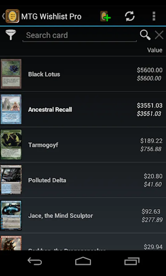 This unofficial app allows you to save your wanted Magic The Gathering cards in a quick way directly on your device showing pictures, live prices from several famous webstores, card text, available expansion sets and more useful data for collecting and trading in your local currency.