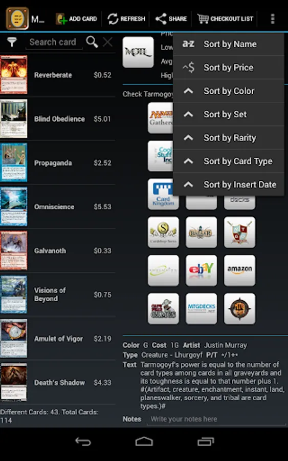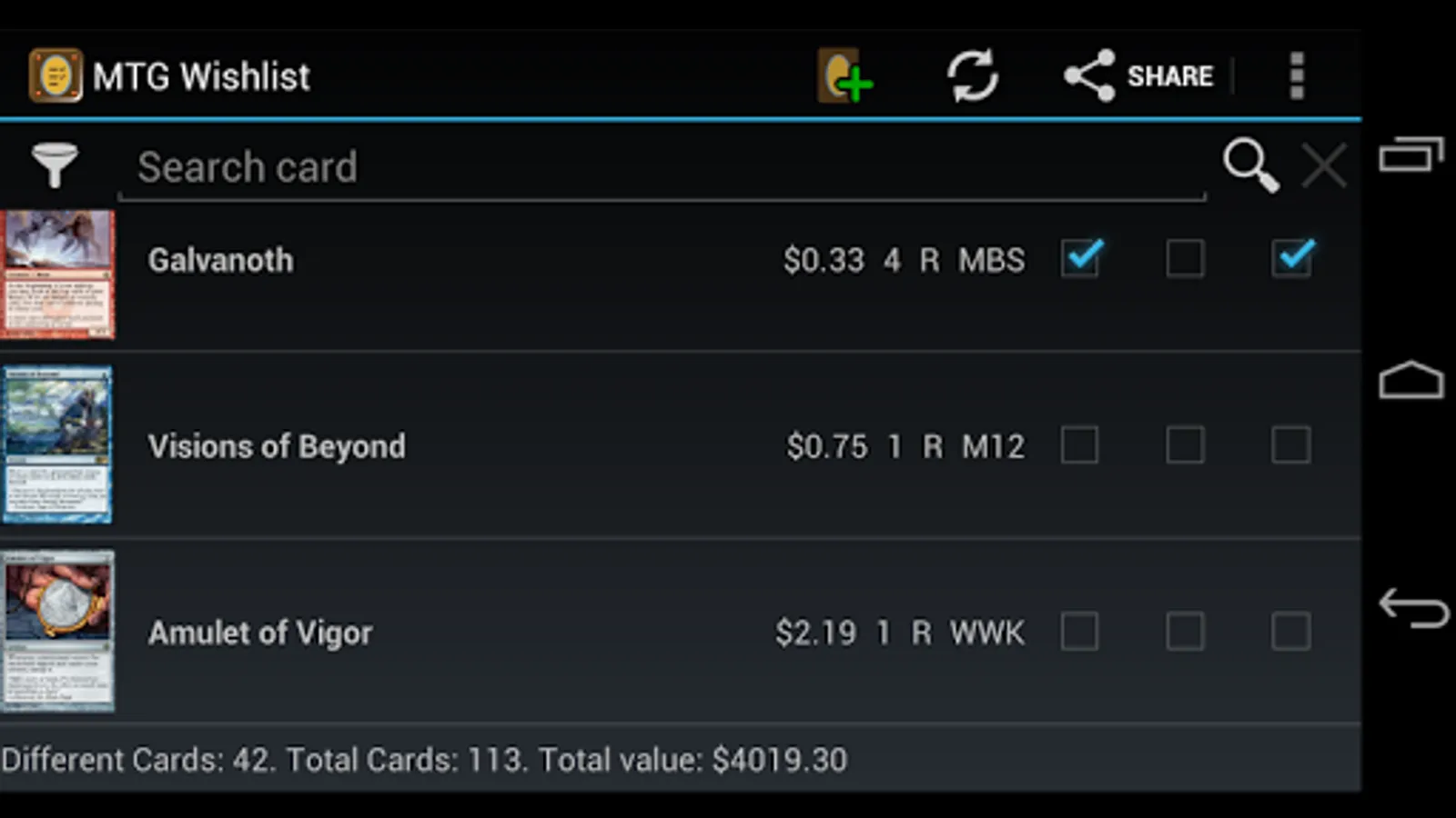 Want a list for your deck and other for your trades? It allows you to create multiple lists and check the real-time value of your collection.