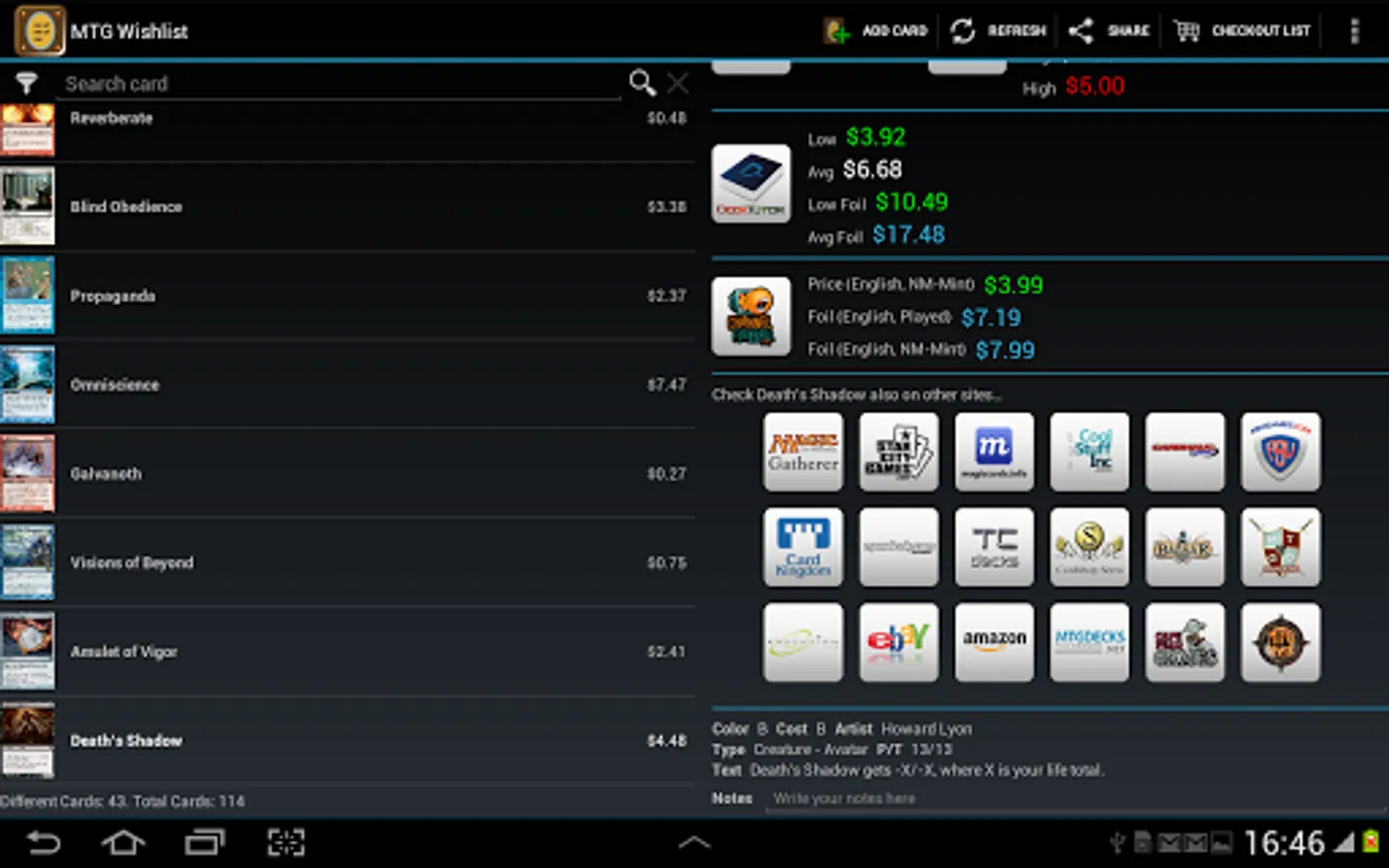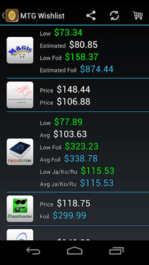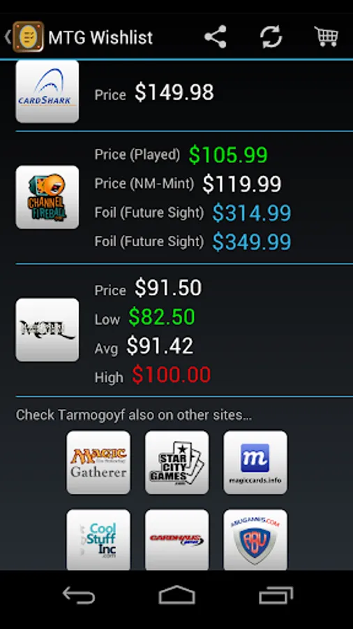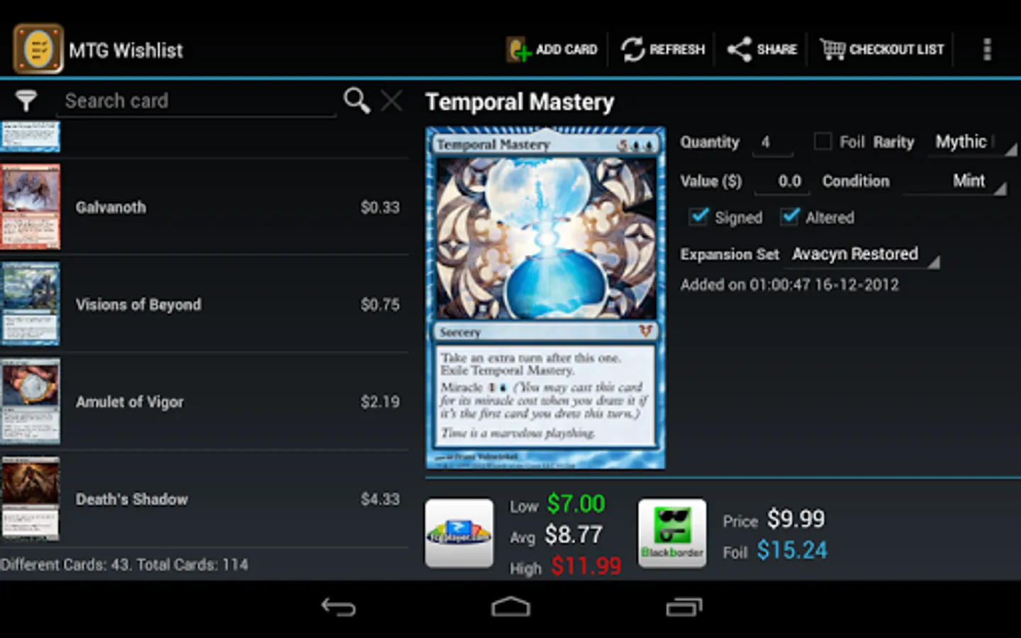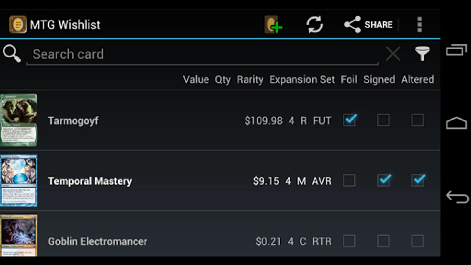 This unofficial app allows you to save your wanted Magic The Gathering cards in a quick way directly on your device showing pictures, live prices from several famous webstores, card text, available expansion sets and more useful data for collecting and trading in your local currency.