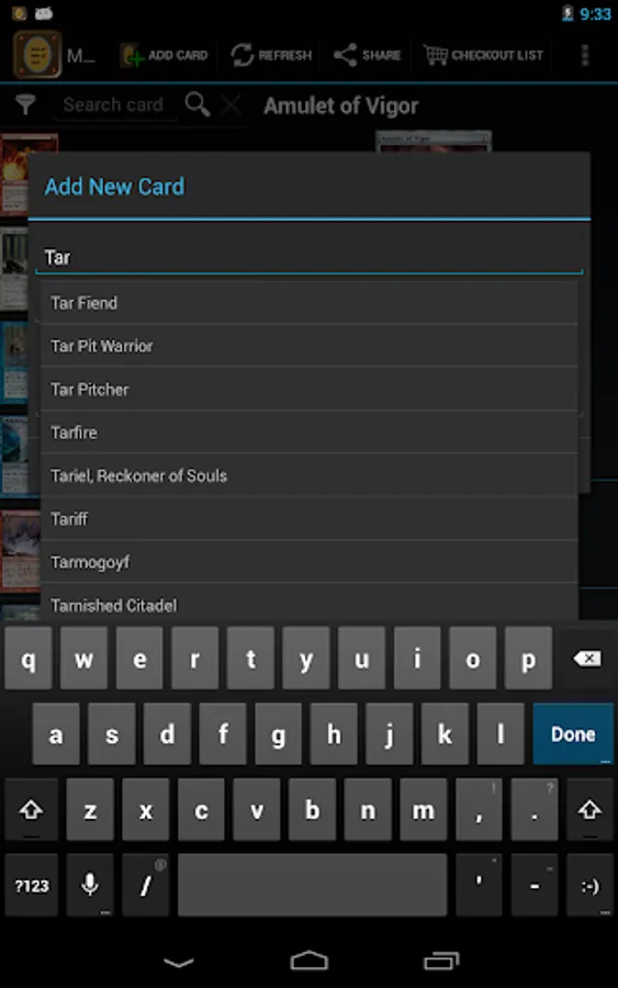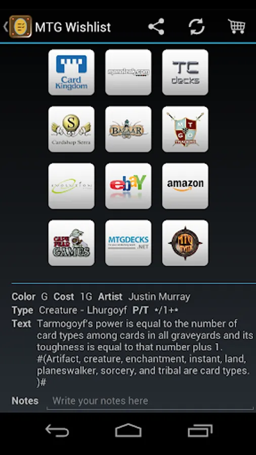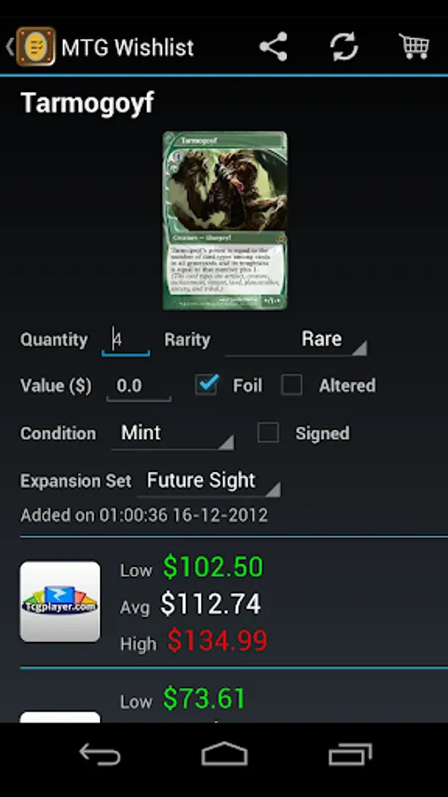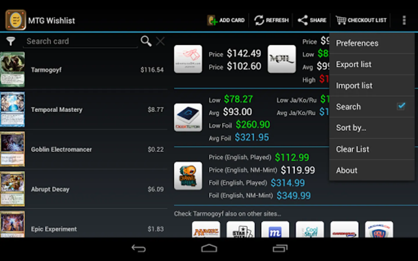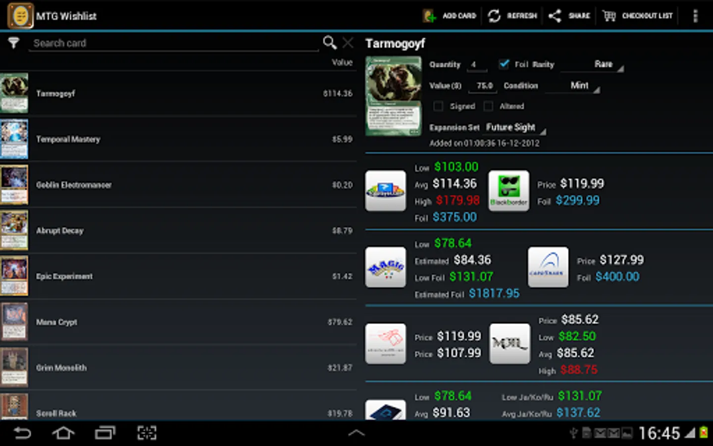 This unofficial app allows you to save your wanted Magic The Gathering cards in a quick way directly on your device showing pictures, live prices from several famous webstores, card text, available expansion sets and more useful data for collecting and trading in your local currency.