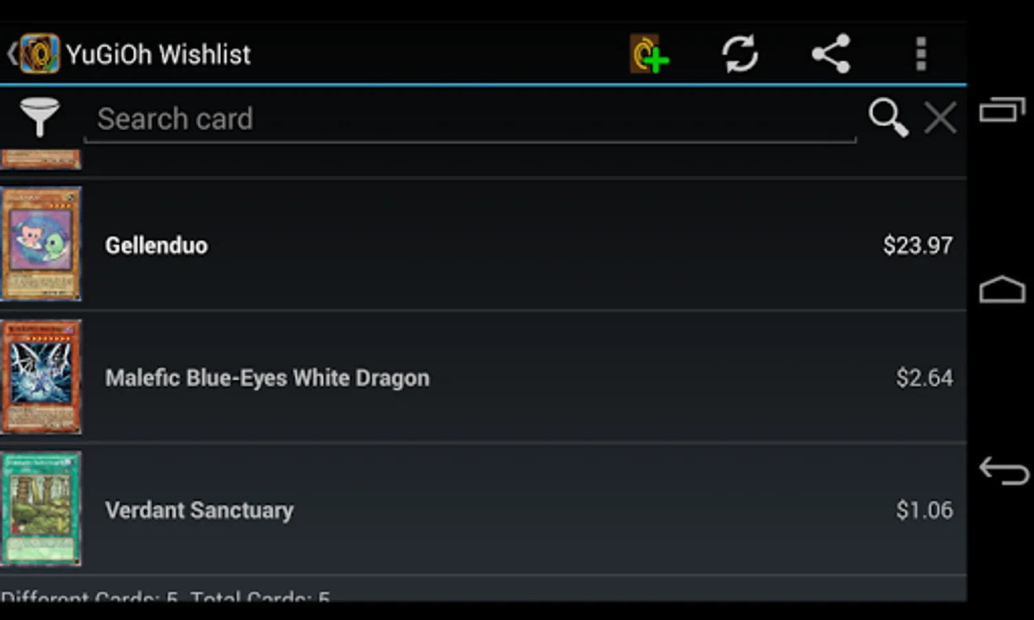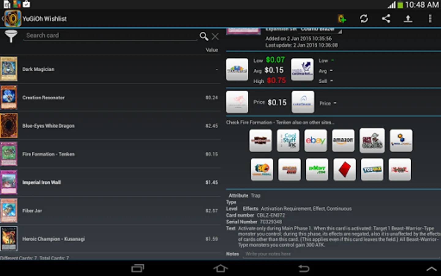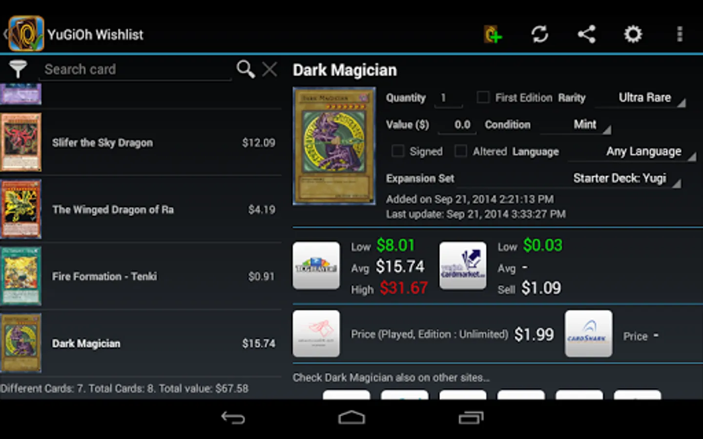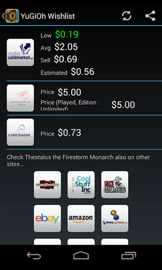 See live card prices for singles directly from webstores such as TCG Player or Yugioh Card Market (it also integrates your Wants and Sells). In addition, you can directly access your favourite cards on some other renowned sites.