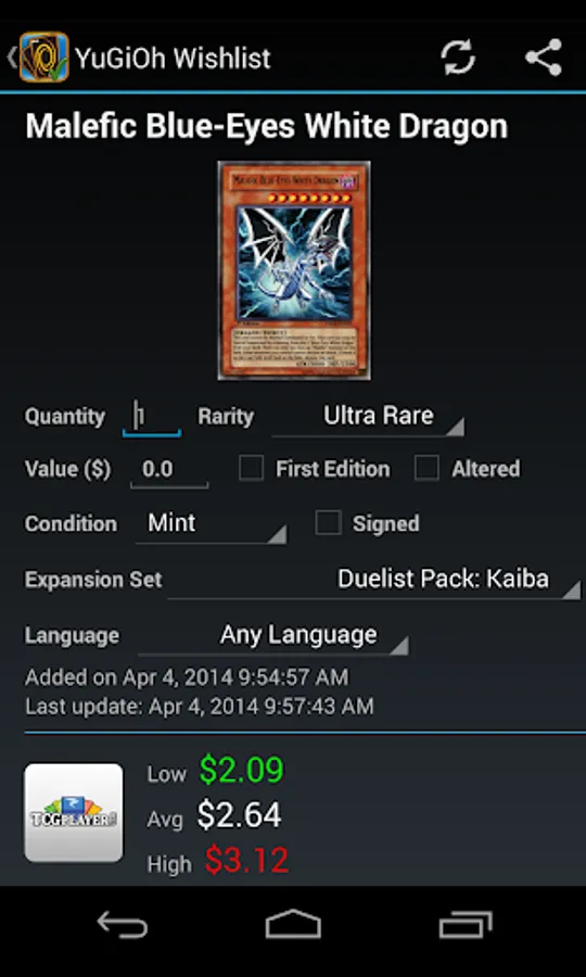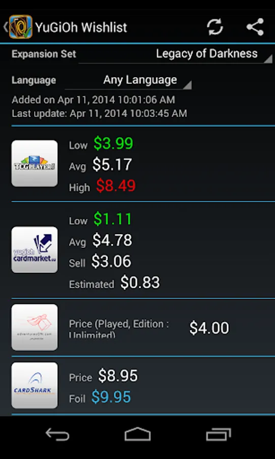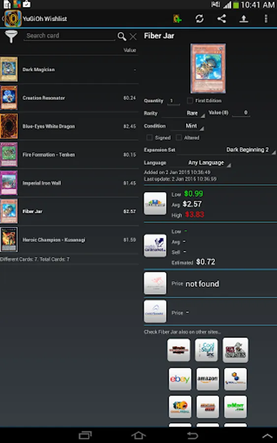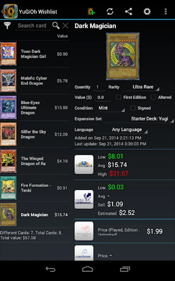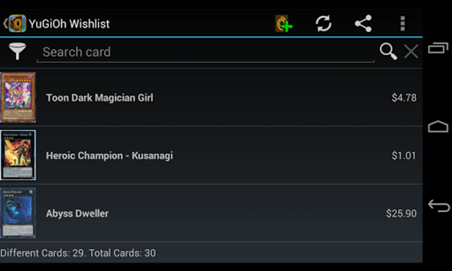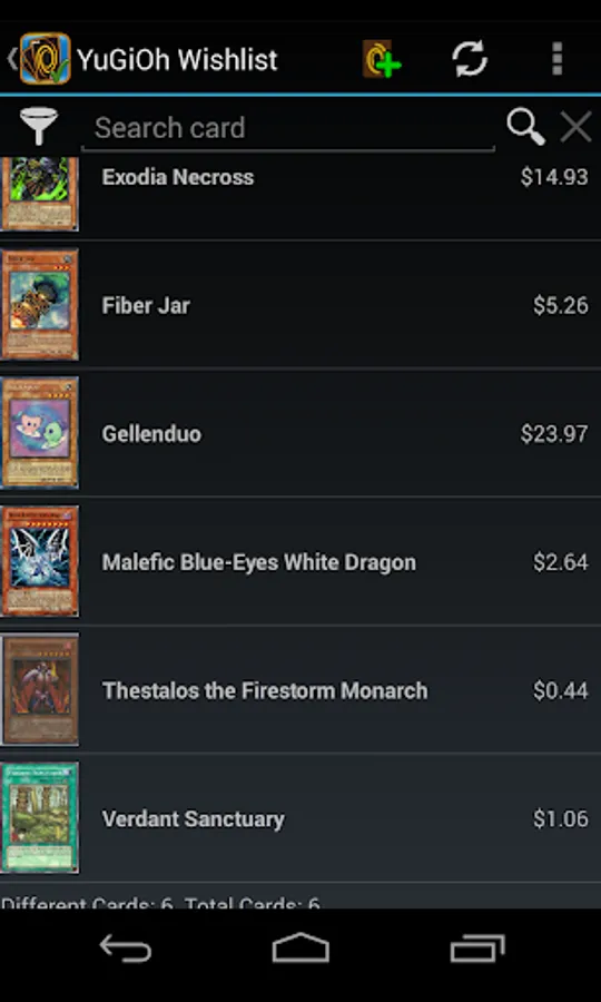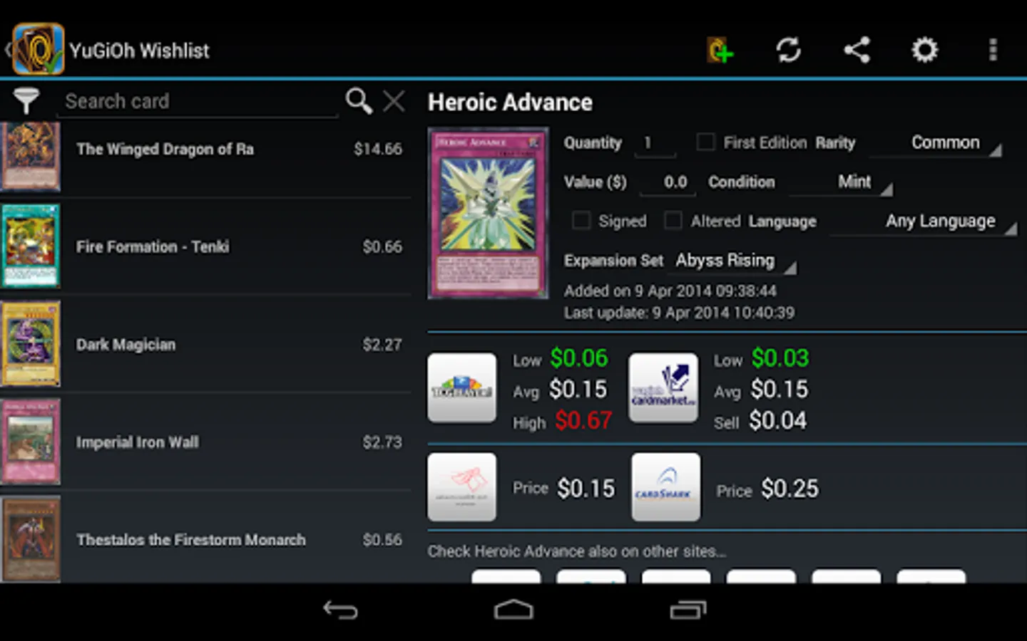 See live card prices for singles directly from webstores such as TCG Player or Yugioh Card Market (it also integrates your Wants and Sells). In addition, you can directly access your favourite cards on some other renowned sites.