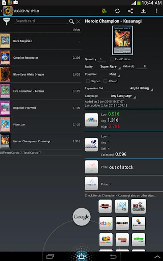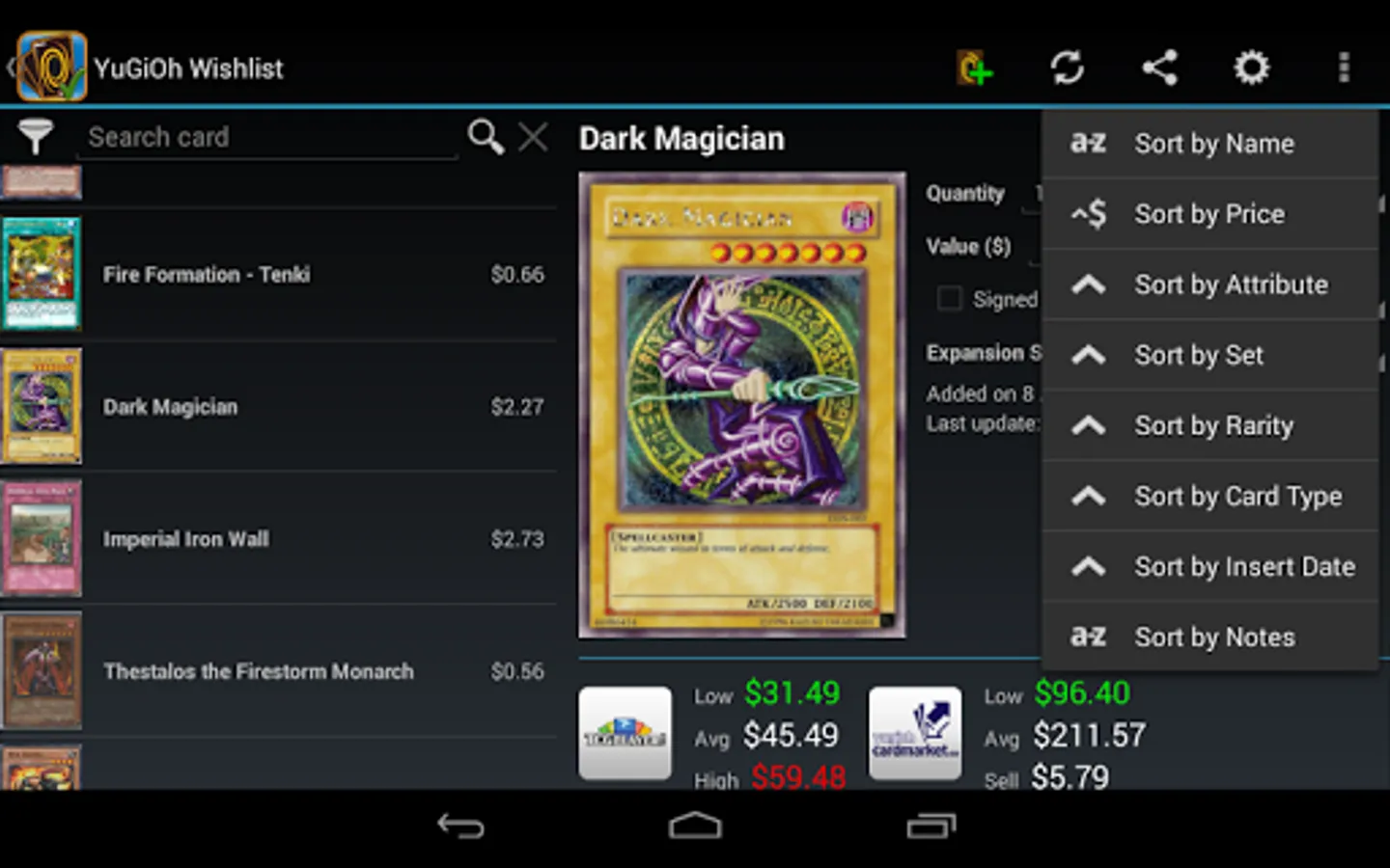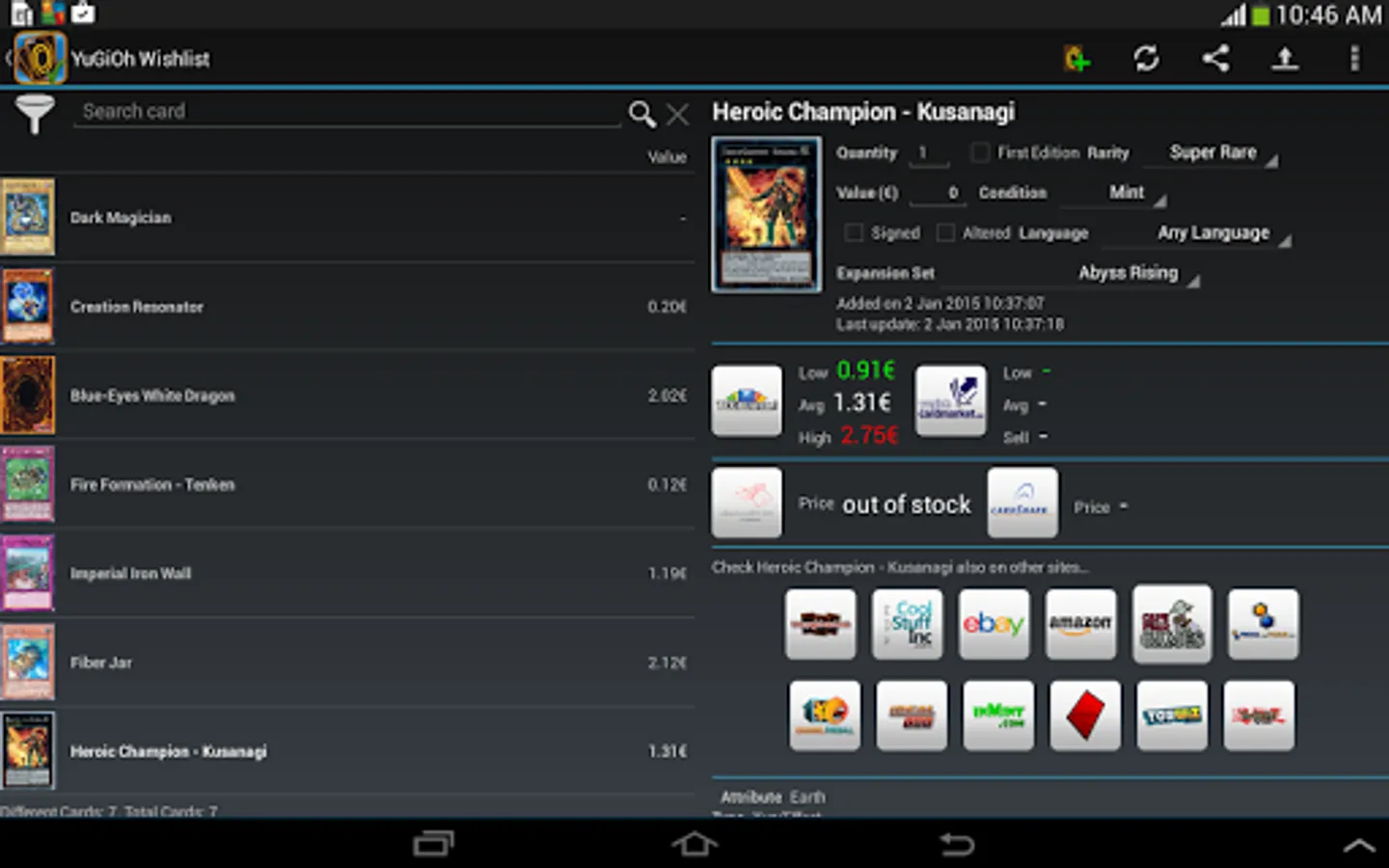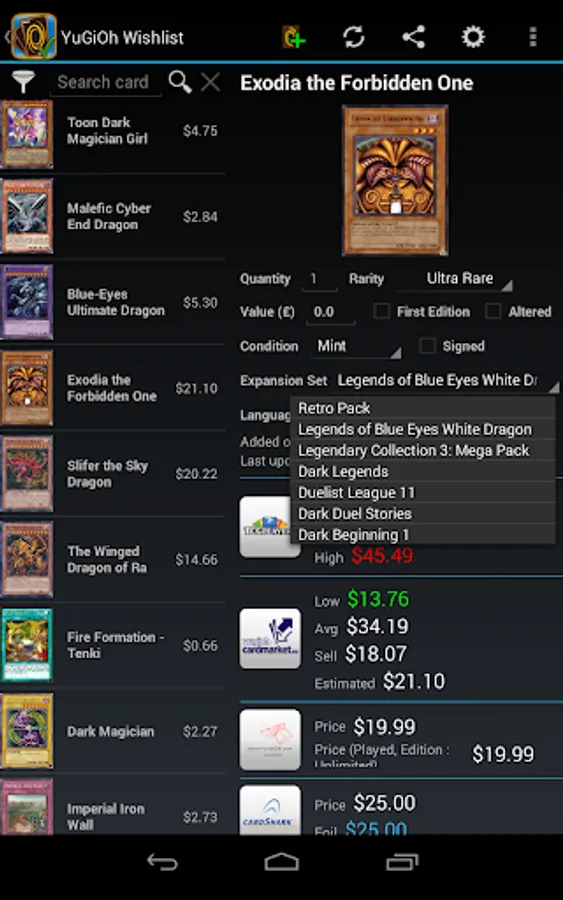 See live card prices for singles directly from webstores such as TCG Player or Yugioh Card Market (it also integrates your Wants and Sells). In addition, you can directly access your favourite cards on some other renowned sites.