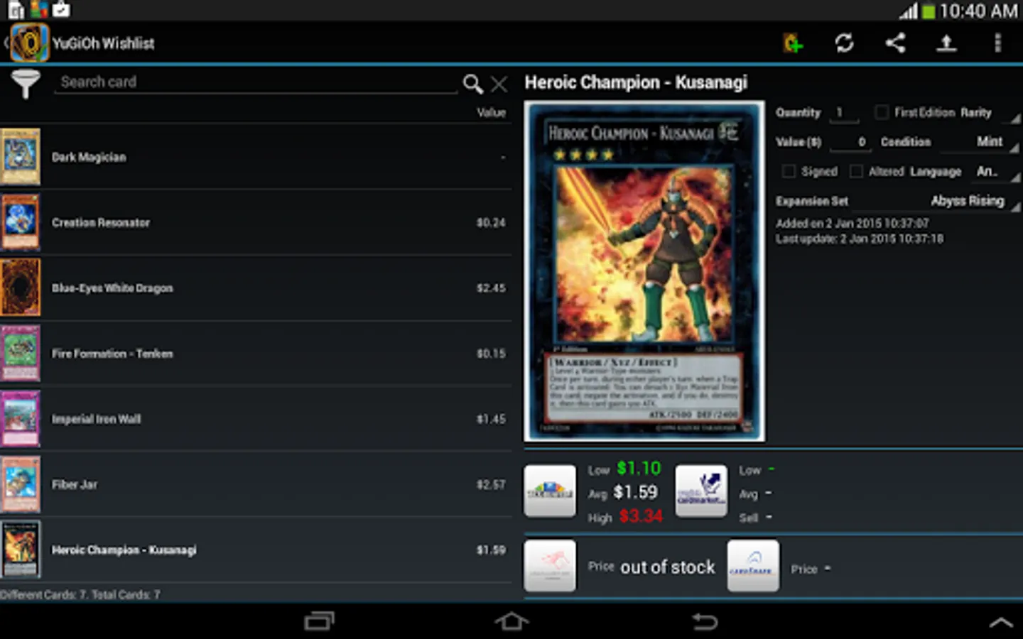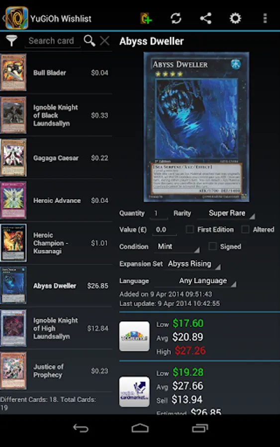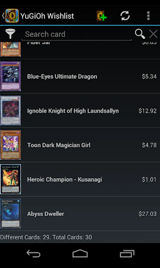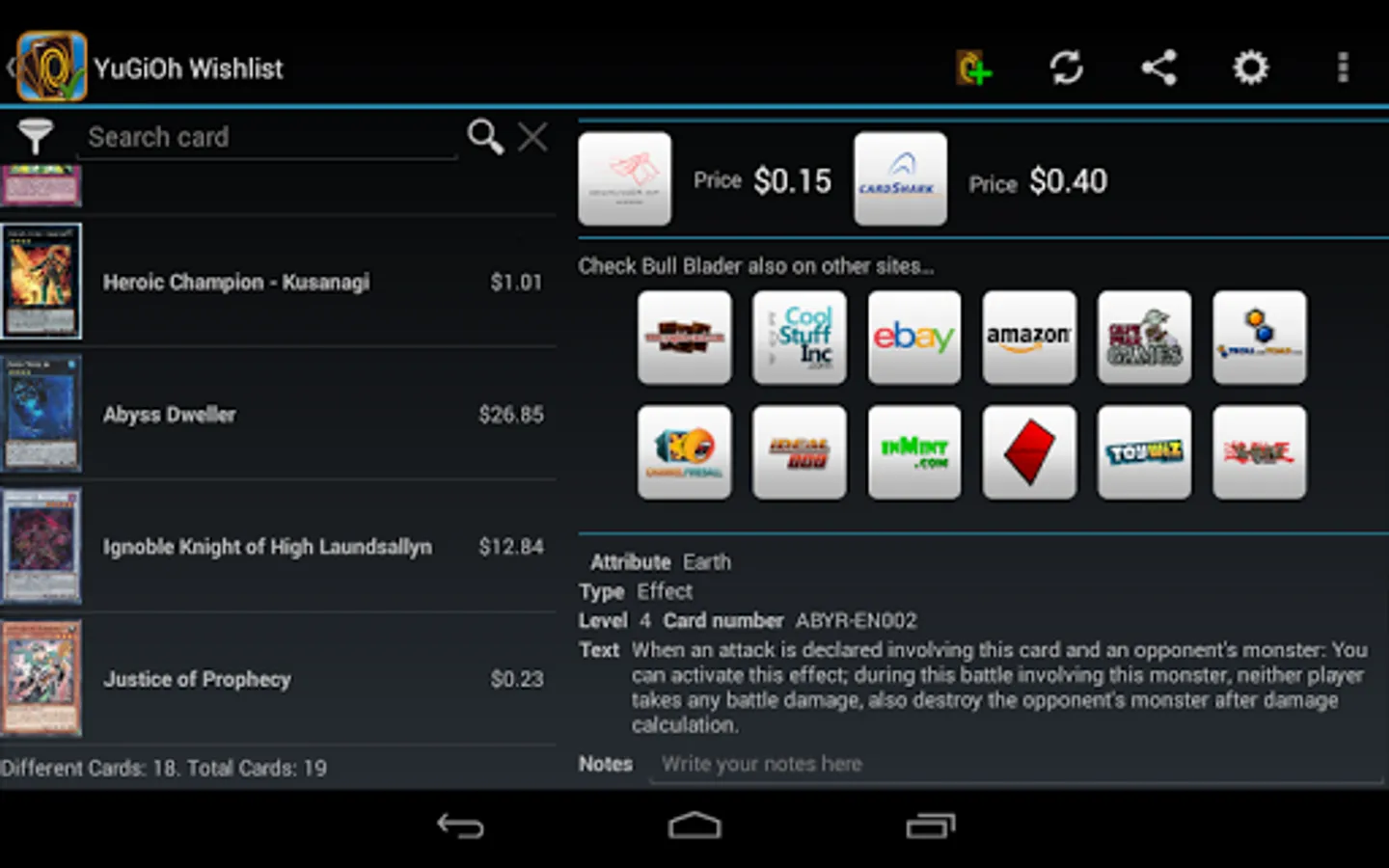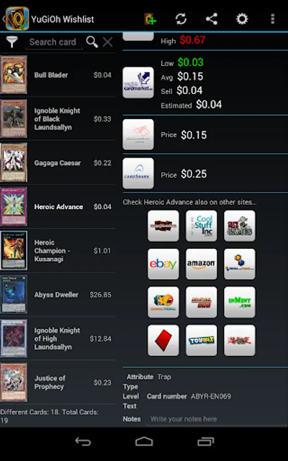 See live card prices for singles directly from webstores such as TCG Player or Yugioh Card Market (it also integrates your Wants and Sells). In addition, you can directly access your favourite cards on some other renowned sites.