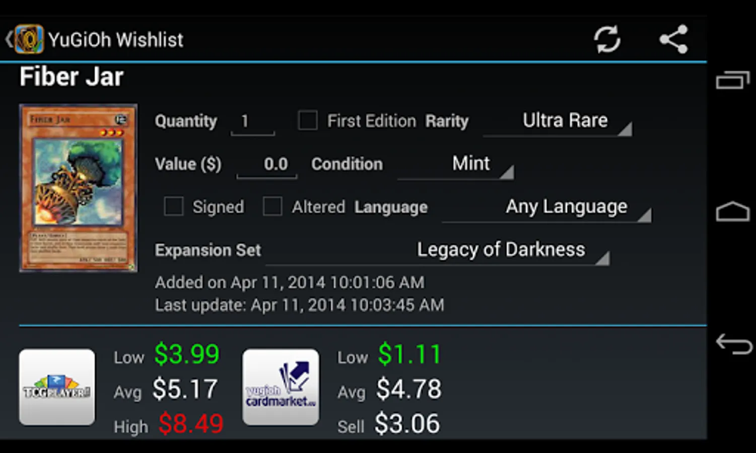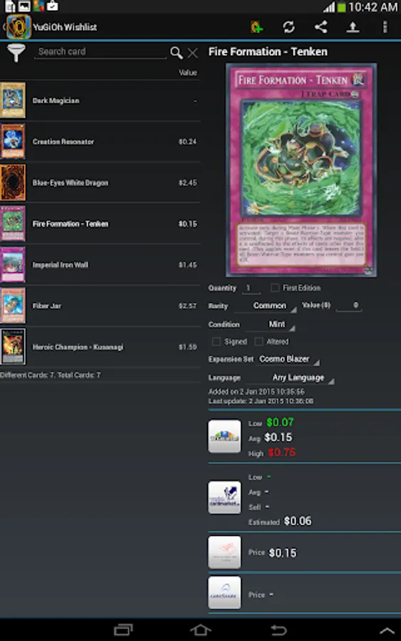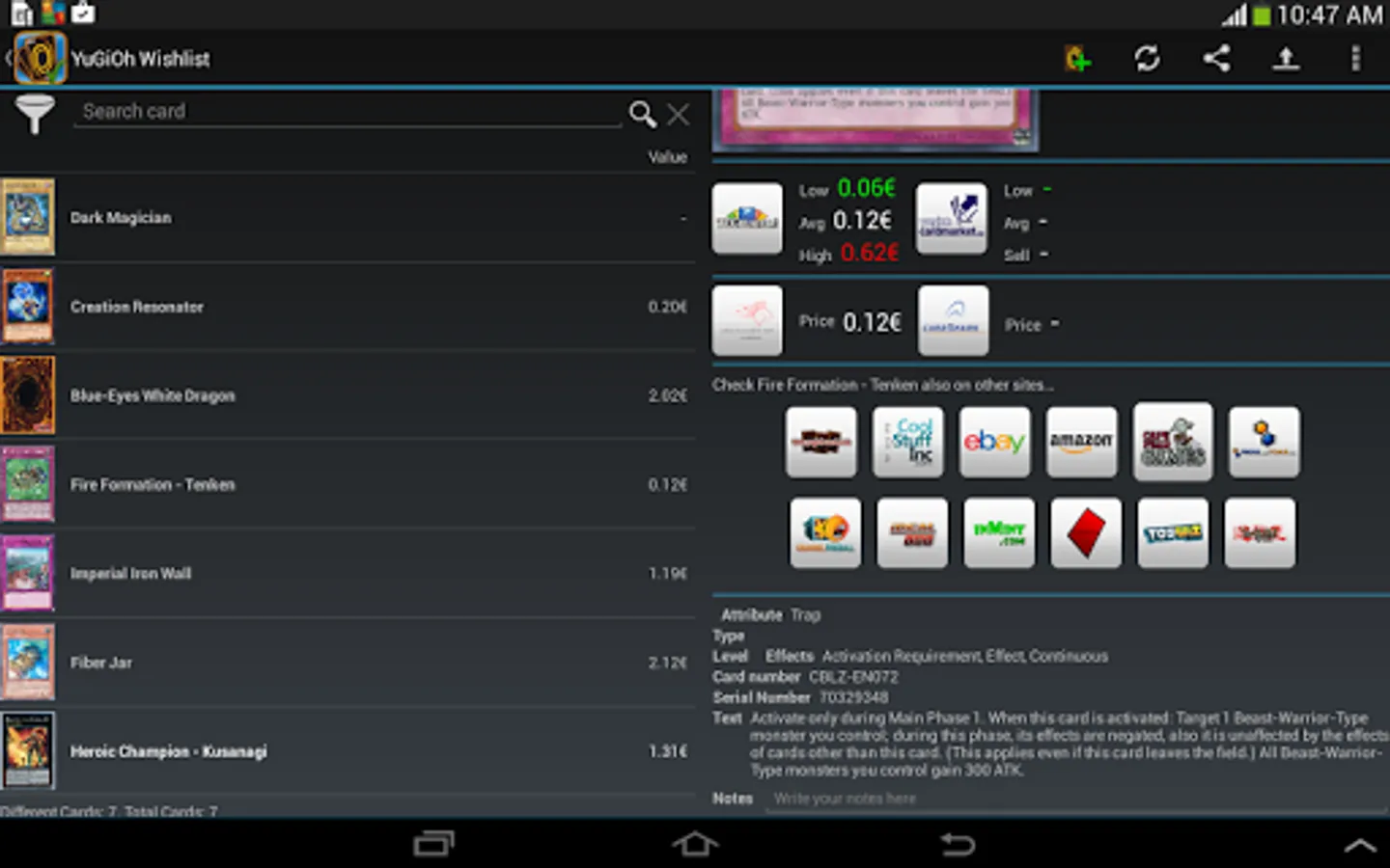 This unofficial app allows you to save your wanted cards in a quick way directly on your device showing pictures, live prices from several famous webstores, card text, available expansion sets and more useful data for collecting and trading in your local currency.