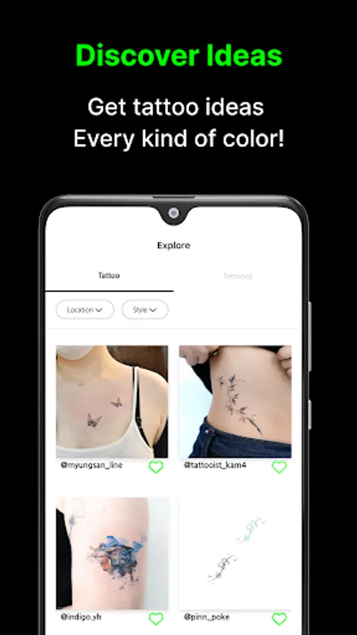 Choose the tattoo style category you want and pick only tattoos of your taste: color tattoo, water color tattoo, oriental tattoo, doodle tattoo and so on. Press "Like" on the preferred tattoo to save your tattoo designs!