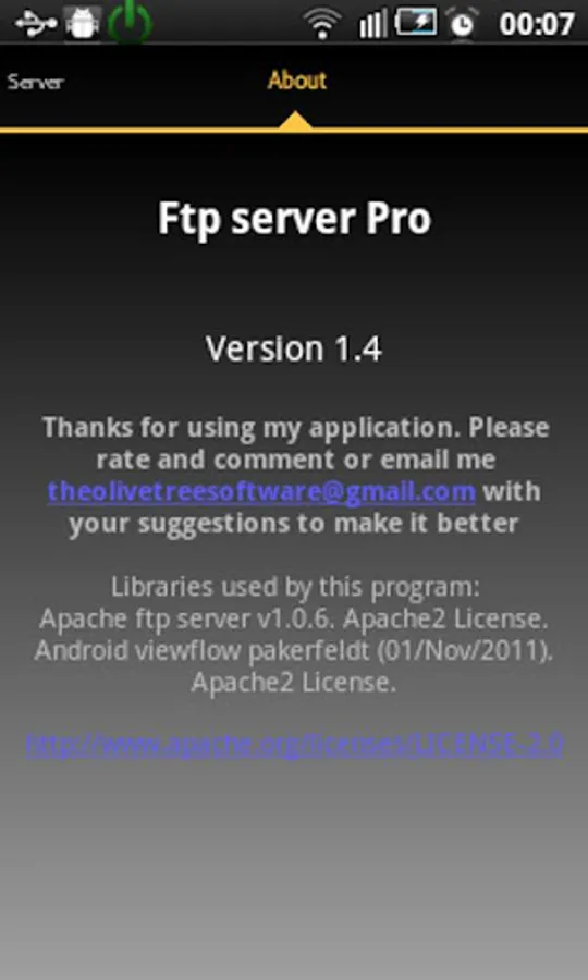 Libraries used by this program: Apache ftp server v1.0.6. Apache2 License. Android viewflow pakerfeldt (01/Nov/2011). Apache2 License: http://www.apache.org/licenses/LICENSE-2.0.html