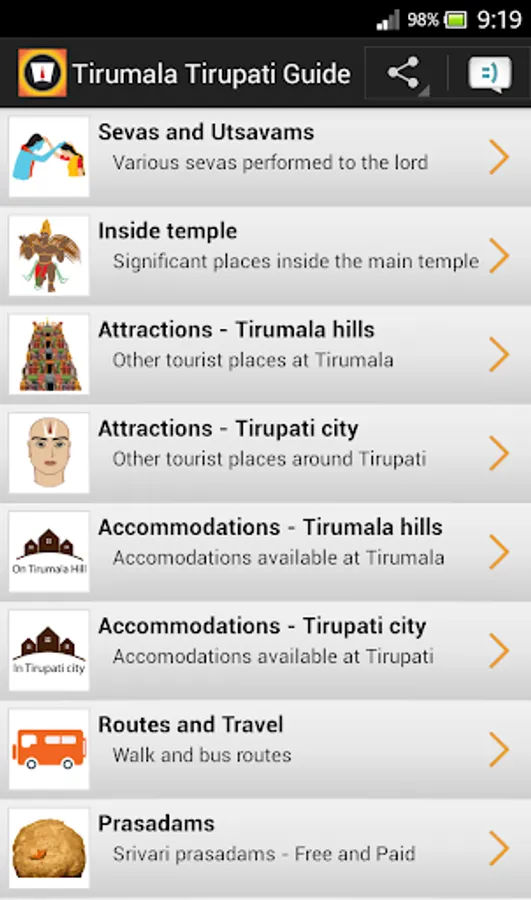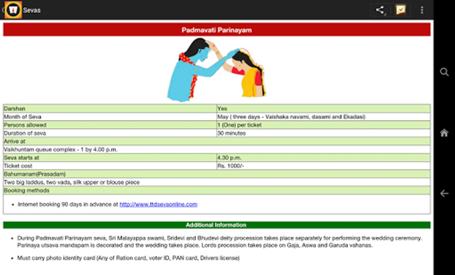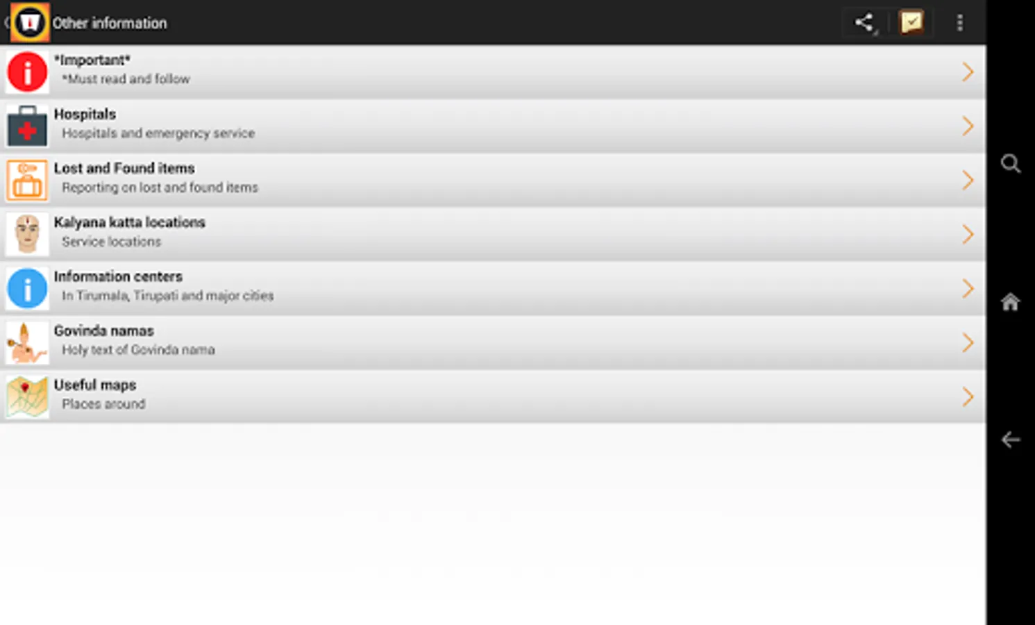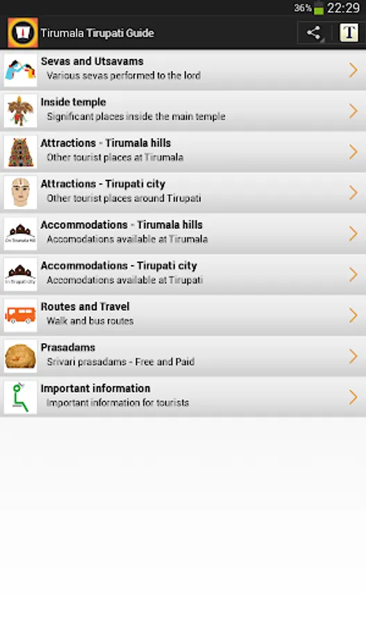 This app looks at the various Sevas and Utsavams that are performed to the Lord, significant places that are located inside the main temple and attractions that are located in Tirupati city, accommodations that are located on Tirumala hills and in Tirupati city, routes and travel locations and important information for tourists visiting the area.