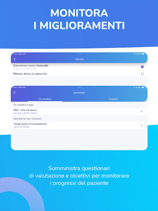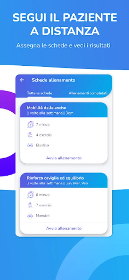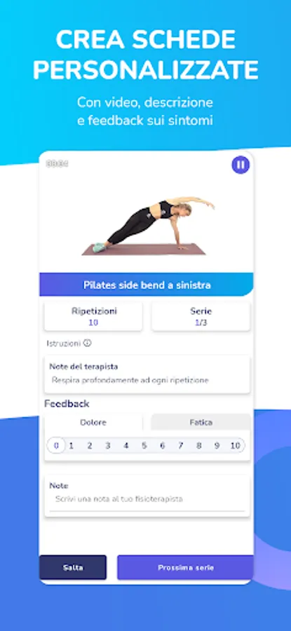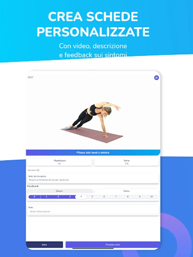 The patient will be able to provide you with real-time feedback during the execution of the training card, mark the pain and perceived fatigue or write down notes. All the information collected during the training will be immediately visible to the therapist, who will thus see the duration, the exercises performed and those skipped and the difficulties experienced by the patient.