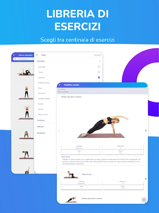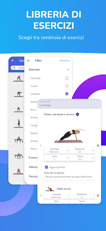 • Create exercise cards quickly. The filters allow you to select the right exercise based on the district, the function, the position of the body and the tool to be used;