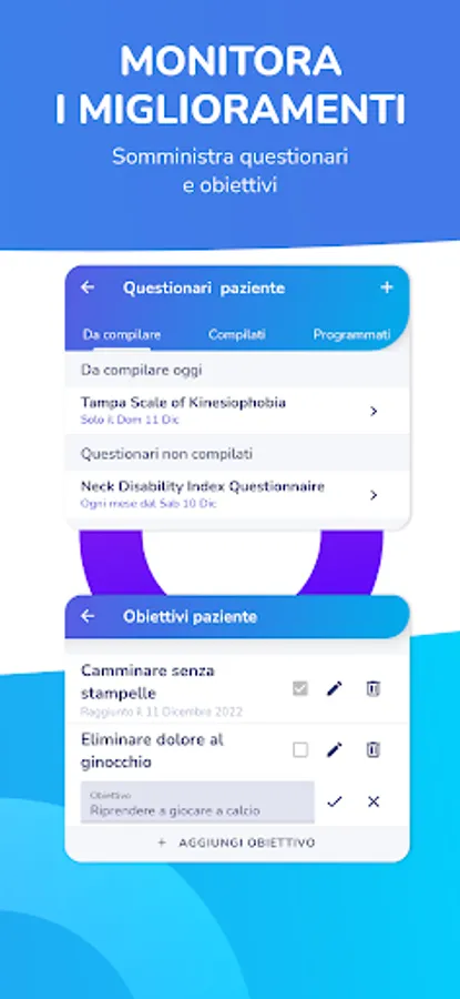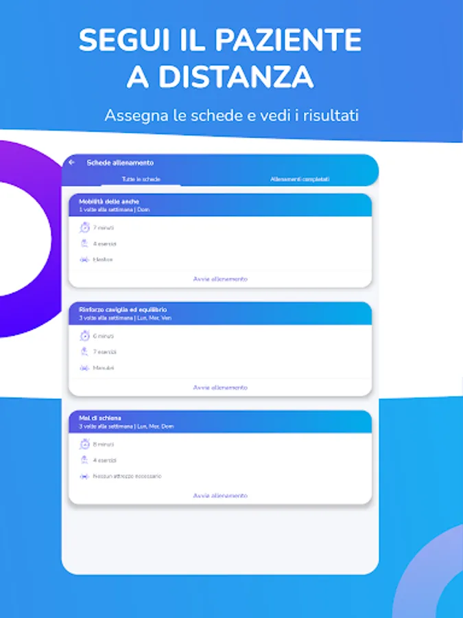 The app is suitable for everyone, designed for people of all ages. The exercises are shown to the patient via video and from different angles. The textual description, fully customizable by the therapist, explains step by step how to perform the exercise.