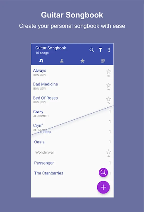 Guitar Songbook works flawlessly also with higher amount of songs(tested with 1000) so it should meet the criteria also for more enthusiastic players.