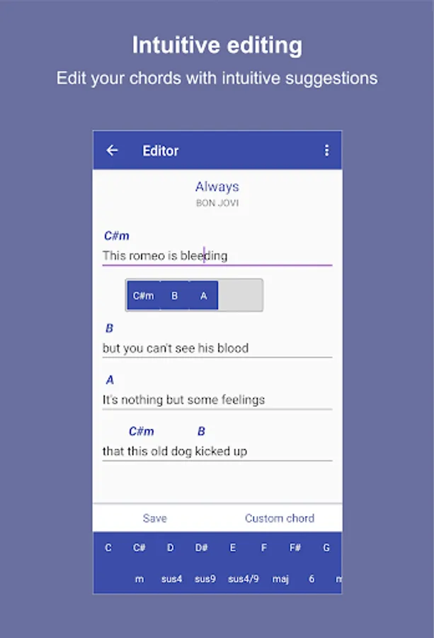 Use the Editor to insert song lyrics and then add chords on desired locations and save. Editing is very fast and intuitive providing chord suggestions based on the chords that you already entered so your finger rarely has to wander far off from the currently edited text.
