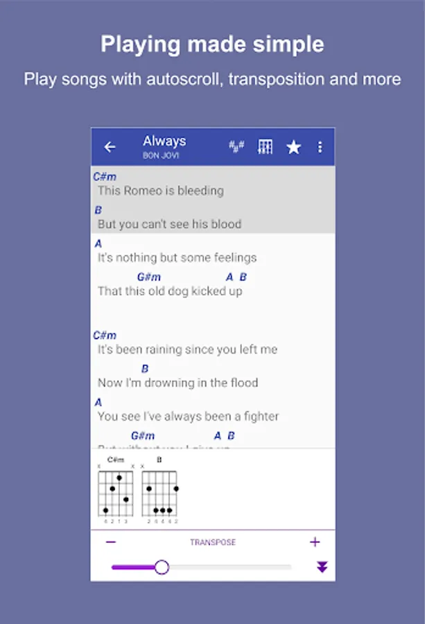 In the Viewer you can transpose your song, use auto-scroll and display chord diagrams of the currently played lines.