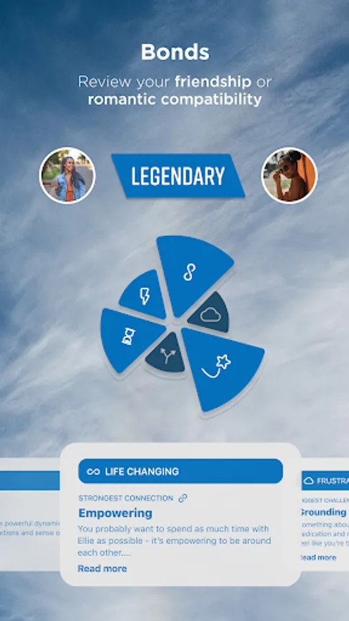 -Bonds: Explore your unique compatibility with friends and romantic interests. Review detailed information about your most important relationships - you can even run a bond with your favorite celebrities by searching our public figures database.