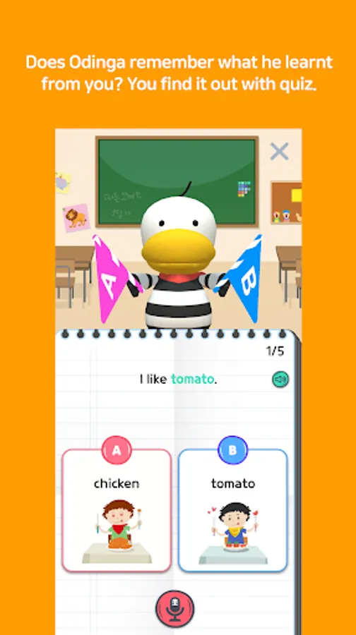 1. Vocabulary : Your kid teaches Odinga 5 words at a time with pictures and example sentences from elementary words to advanced words by subject.