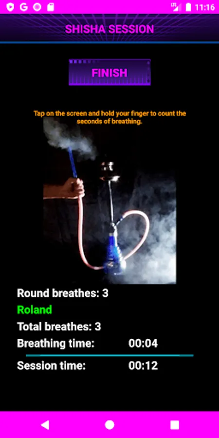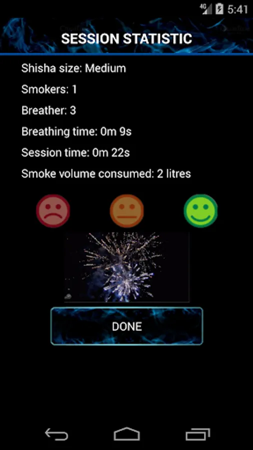 4) once you finished the Shisha session - you will see the statistic of how much volume of smoke you consumed, how much breathes you made and total Shisha time.