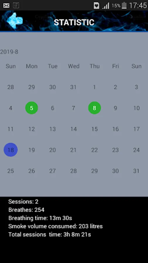 In Calendar menu you can find all your Shisha sessions per month and total monthly statistic.