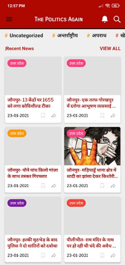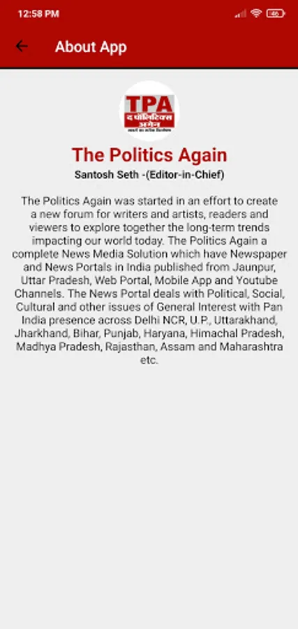 Get Latest and Breaking News in Hindi at your fingertips. The Politics Again Mobile News App provides latest Hindi News, breaking news from India and World about current affairs, Sports, Business, Entertainment, Bollywood, Hollywood and much more. You will also get video news content, photo news etc. Download to experience ! The Politics Again's Mobile News App is India's No.1 Hindi News Portal and Online News. So, install this app and Stay updated with breaking news & daily News Headlines on Politics, Business, Technology, Science, Health, Travel, Bollywood, Sports & much more for India & World. From anywhere, anytime!