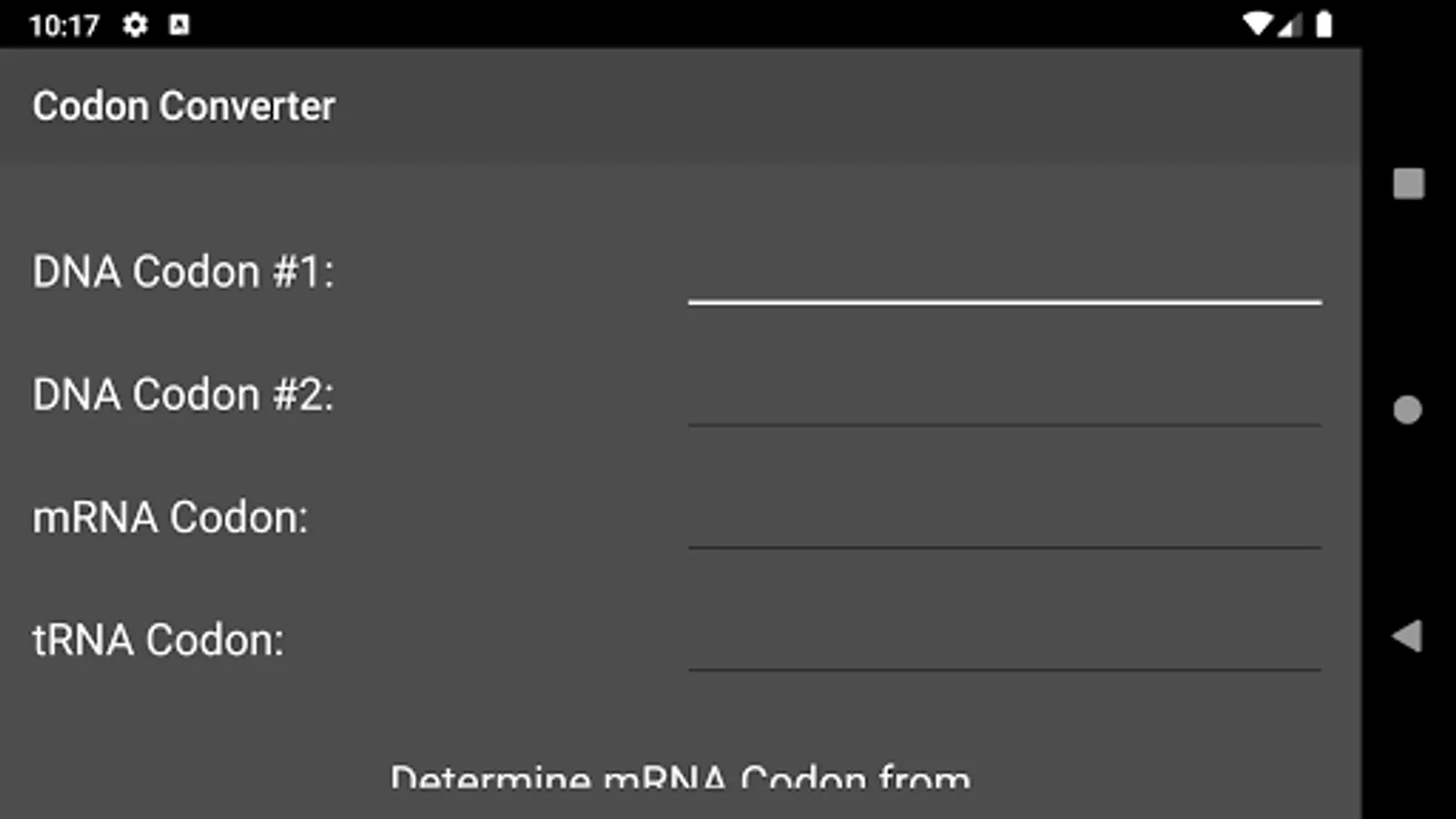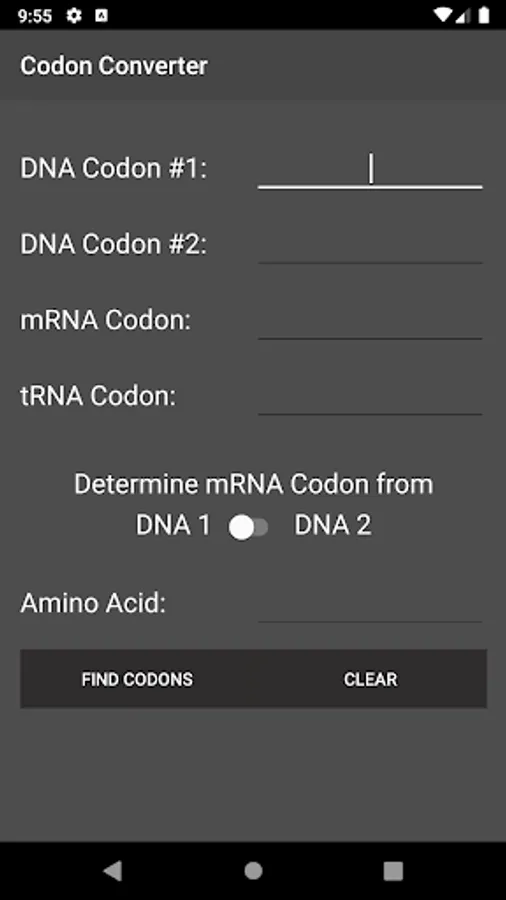 The DNA and RNA Codon Converter is a simple app that allows for users to convert DNA and RNA codons to different forms as well as their resulting amino acid.