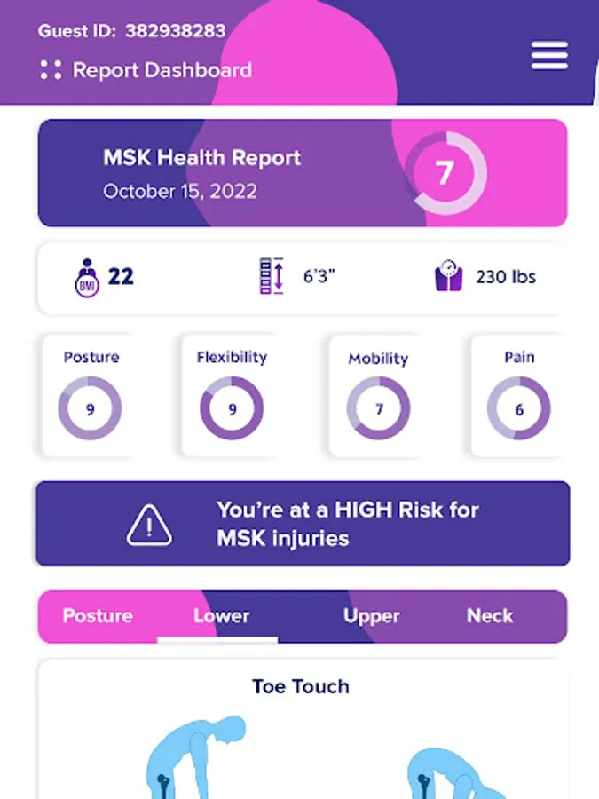 Employees and health-plan members can use the TheraNow platform for comprehensive risk-profiling of possible musculoskeletal injuries through computer-vision technology and artificial intelligence, and prevent them from happening. Members with higher risk profiles can get on 1-on-1 live sessions with expert board-certified physical therapists or health coaches for personalized care. Users are provided with app-based home exercise programs. Comprehensive outcome tracking facilitates compliance and recovery. The platform is completely HIPAA-compliant providing a secure environment to the users and the providers to seamlessly communicate.